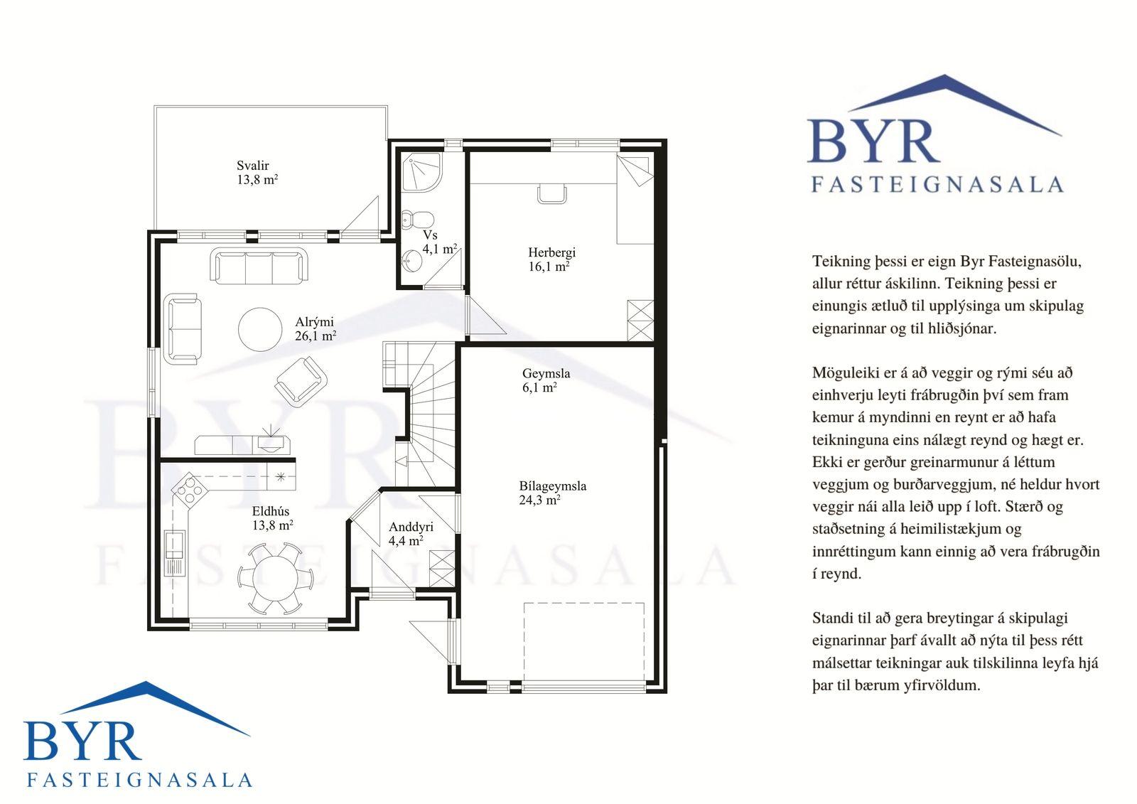 Skipulag eignar;Efri hæð: Anddyri, alrými með stofu, borðstofu og eldhúsi, herbergi, baðherbergi, stigi, bílskúr og geymsla.