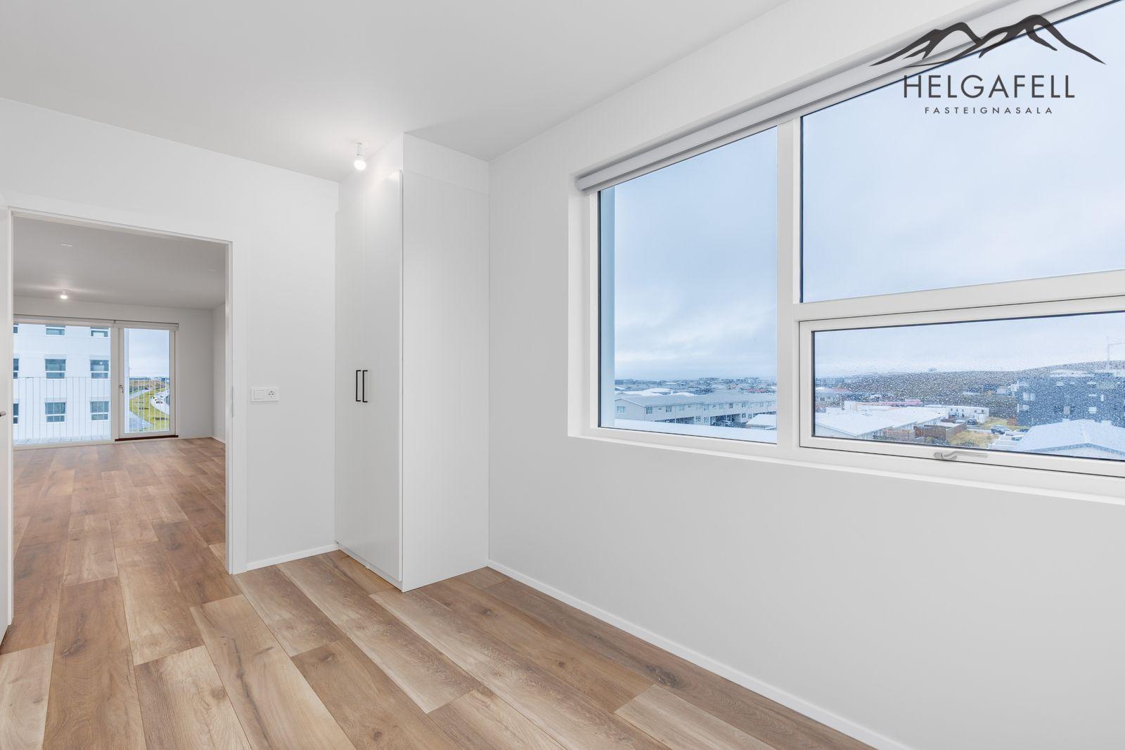 Helgafell fasteignasala kynnir nýja fimm herbergja fullbúna endaíbúð á fimmtu hæð, merkt 0501 við Áshamar 5 í Hafnarfirði.