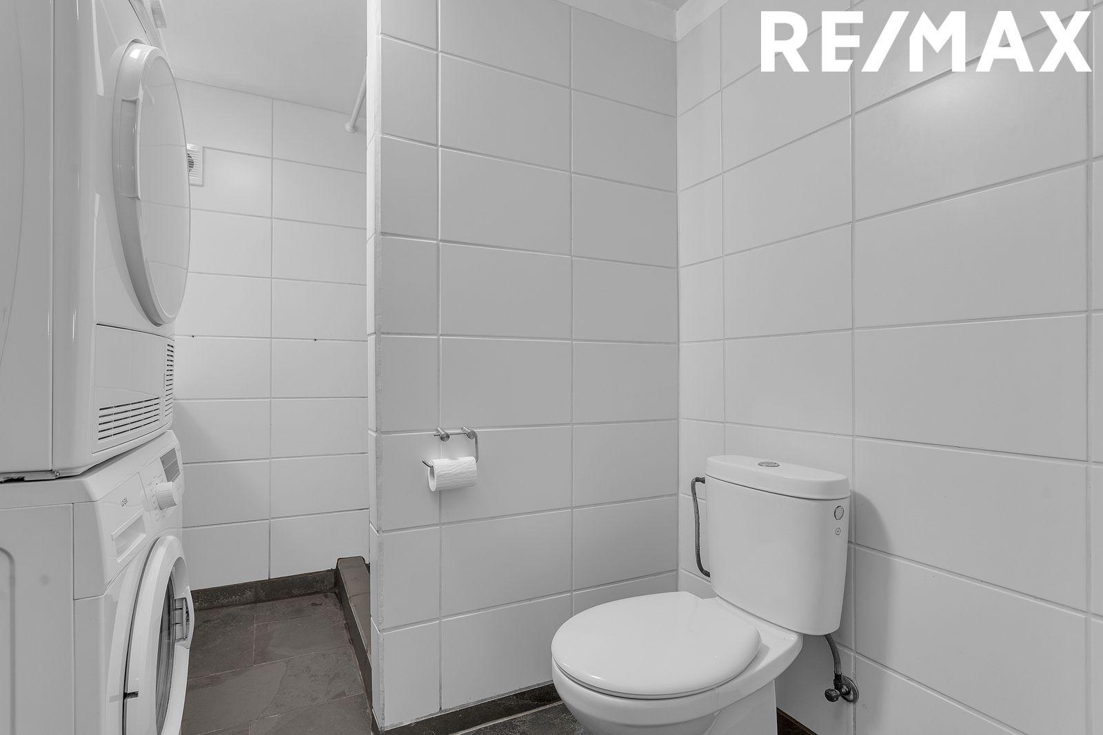 Baðherbergi með sturtu, klósetti, vaskaskáp og stæði fyrir þvottavél.