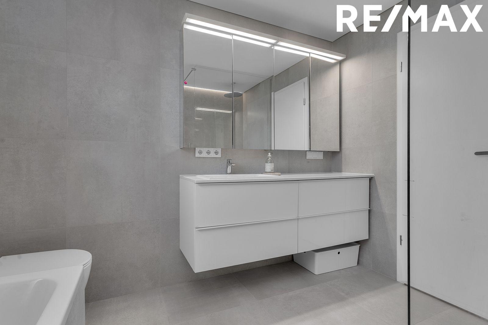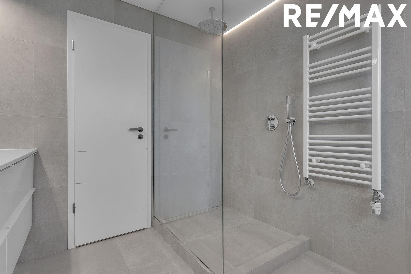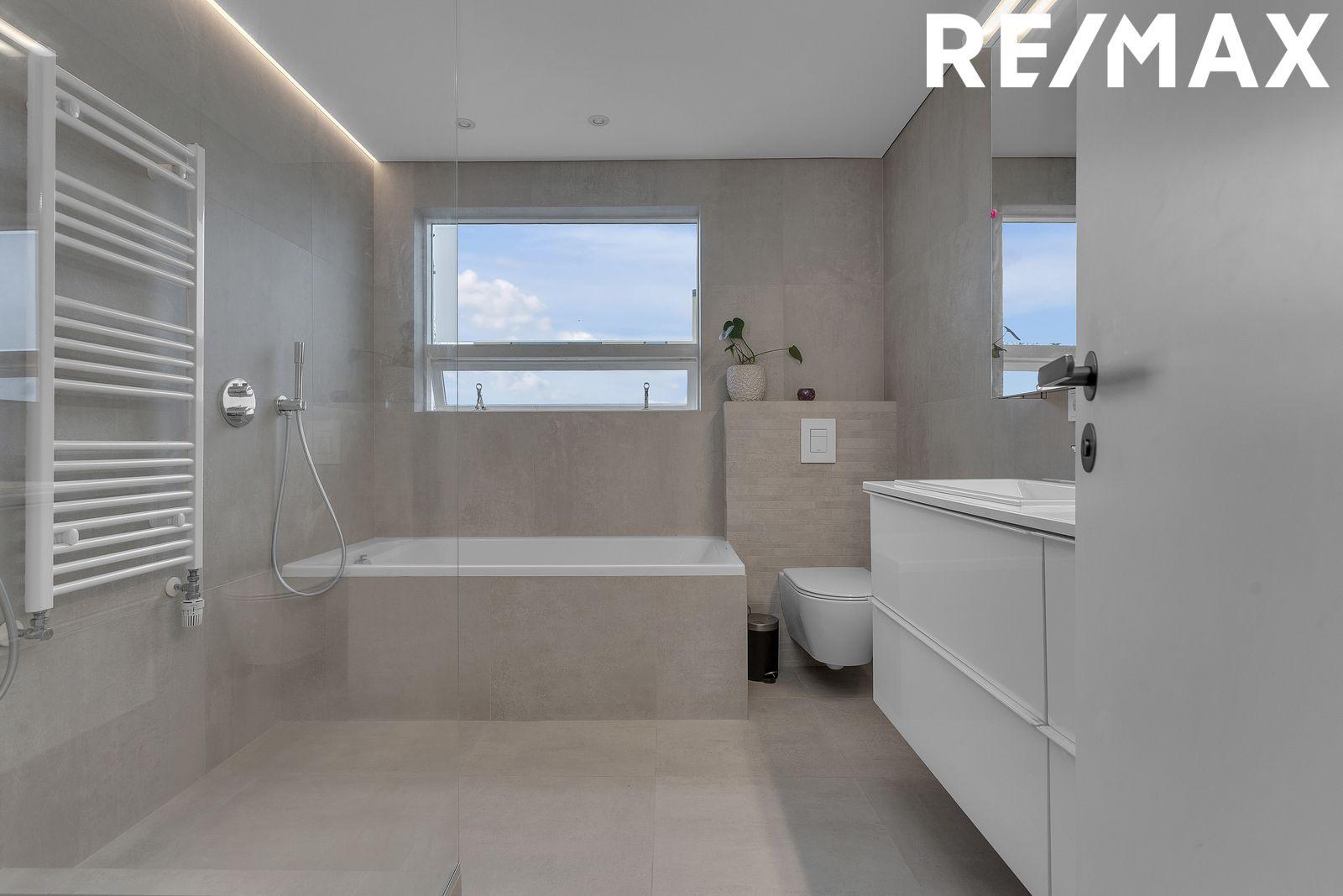 Baðherbergið er uppgert 2022. Baðkar, walk in sturta með innbyggðum tækjum, upphengt klósett, handklæðaofn og innrétting.