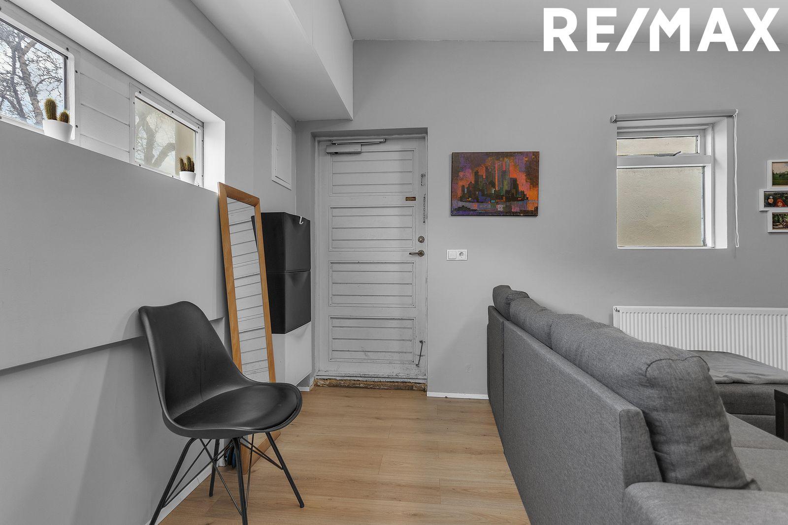 Þvottahús er í kjallara en þar er vinnuvaskur, gluggi til að lofta og flísar á gólfi.