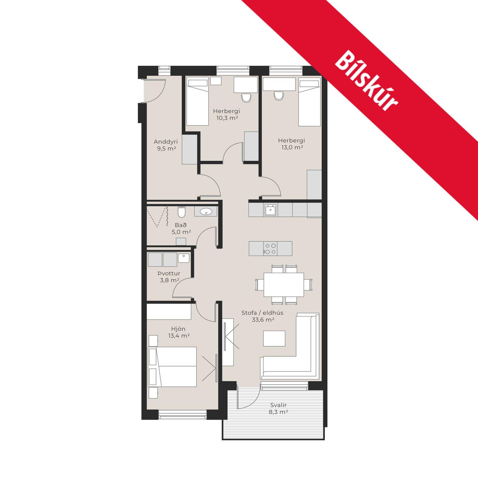 ** Áætlað fasteignamat fyrir 2026 er 113.900.000kr ***Nýleg Íbúð með þremur svefnherberjum, gólfefnum, innbyggðri uppþvottavél, ísskáp með frysti og ljósum. Ljós eru innbyggð að hluta, kubbaljós, ljósakúplar og kastarar fylgja. Baðherbergi eru flísalögð, bæði veggir og gólf. Gólf á þvottahúsi eru flísalagt. Nánari lýsing eignar nr.230, 4ra herbergja íbúð á 2.hæð með sér inngang af svölum og 25,6 fm bílskúr með vaski og Topp 4000 á gólfi, bílastæði er fyrir framan bílskúr. Geymsla eignar er sér innan bílskúrs.Forstofa með flísum gólfi og yfirhanfaskáp.