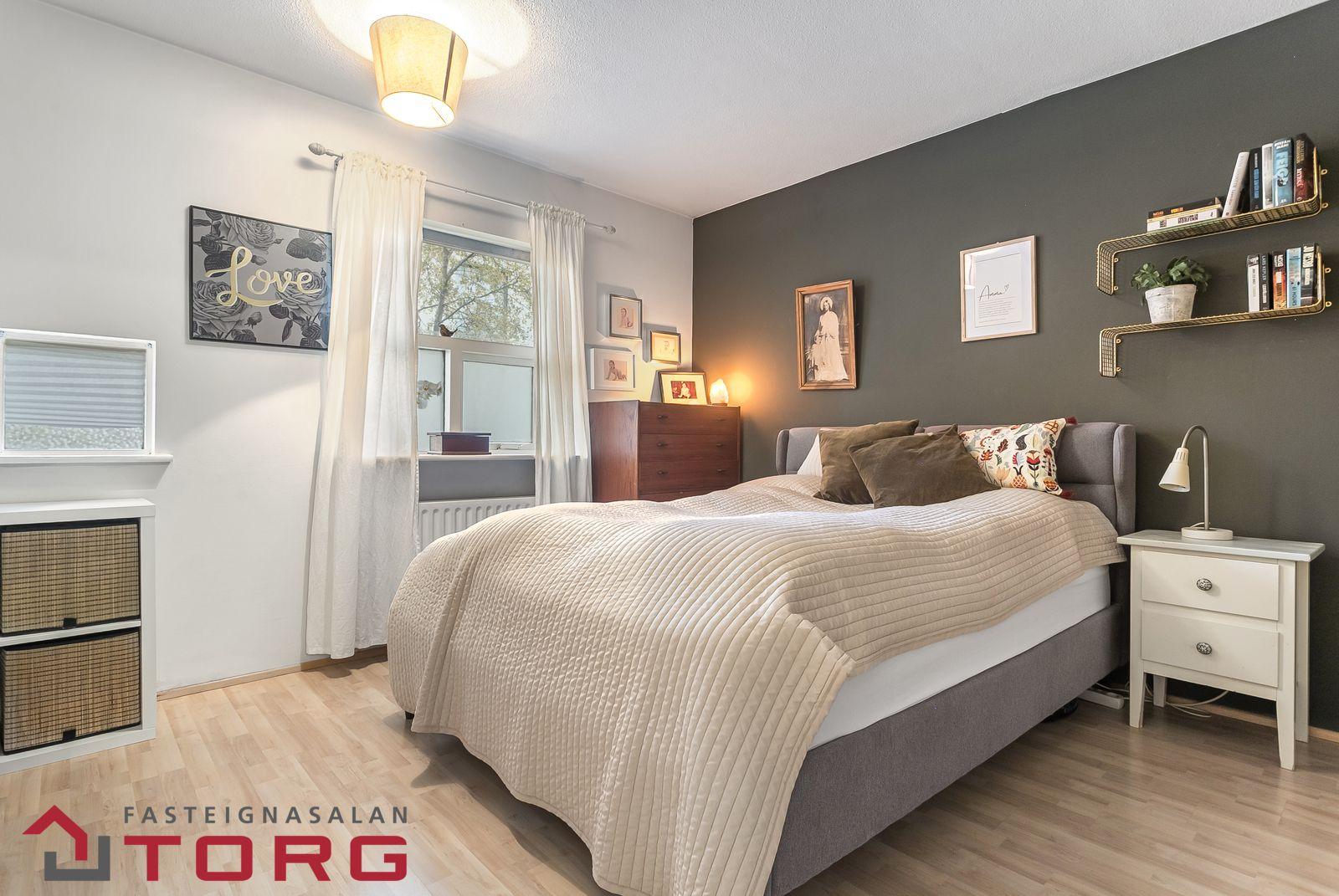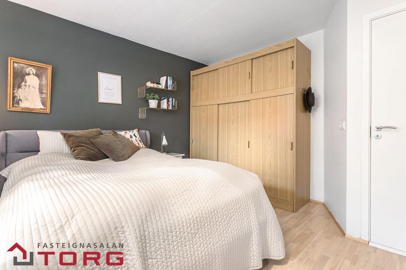 Svefnherbergi er rúmgott með harðparket á gólfi og góðum fataskáp.