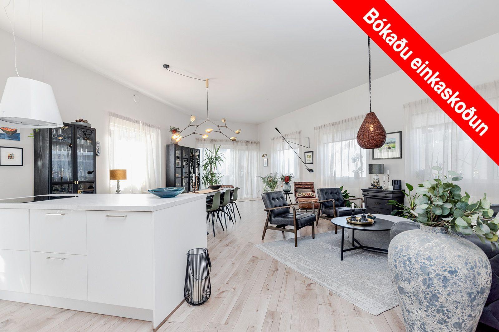 Opið og bjart eldhús með góðu skápa og vinnuplássi í fallegri hvítri innréttingu. Innbyggð tæki í eldhúsi, ísskápur, frystir og uppþvottavél. Ofn í vinnuhæð. Stór eyja með spanhelluborði og góðu skúffuplássi. Innrétting í eldhúsi er frá Nobila í Þýskalandi og tæki frá Electrolux. Stórar stofur og borðstofa með útgengi út á pall. Hjónaherbergi er næst alrými mjög rúmgott með góðu skápaplássi og sér baðherbergi með sturtuklefa.