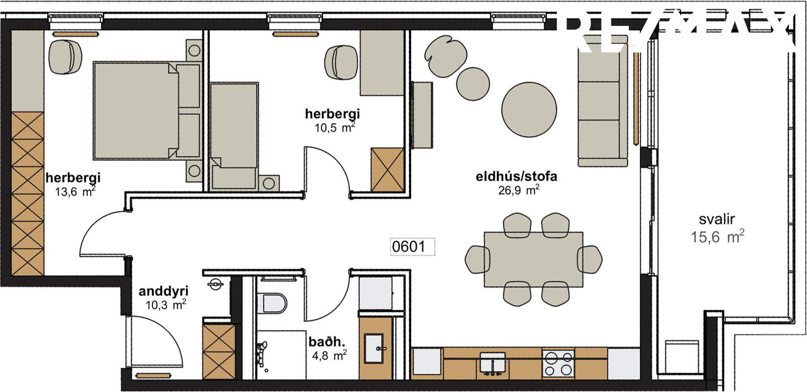 Hringhamar 13-15 í Hamranesinu, Hafnarfirði. Glæsilegar nýjar íbúðir í fallegu og sérlega vönduðu fjölbýlishúsi sem byggt er af traustum verkataka Mótx.Íbúðirnar afhendast fullbúnar án gólfefna. Allar íbúðir eru útbúnar með sérstöku loftræstiskerfi. Kerfið hefur loftskipti í íbúðinni með því að taka loft að utan og dæla því inn í vistarverurnar, herbergi og stofu, og soga lofti út úr baði, þvottahúsi og eldhúsi.Hringhamar.is - Heimasíða verkefnisins.Íbúð 601: 80,6 fm 3ja herbergja íbúð á 6.hæð ásamt stæði í bílageymslu. Íbúðin er 77,1 fm ásamt 3,5 fm geymslu.