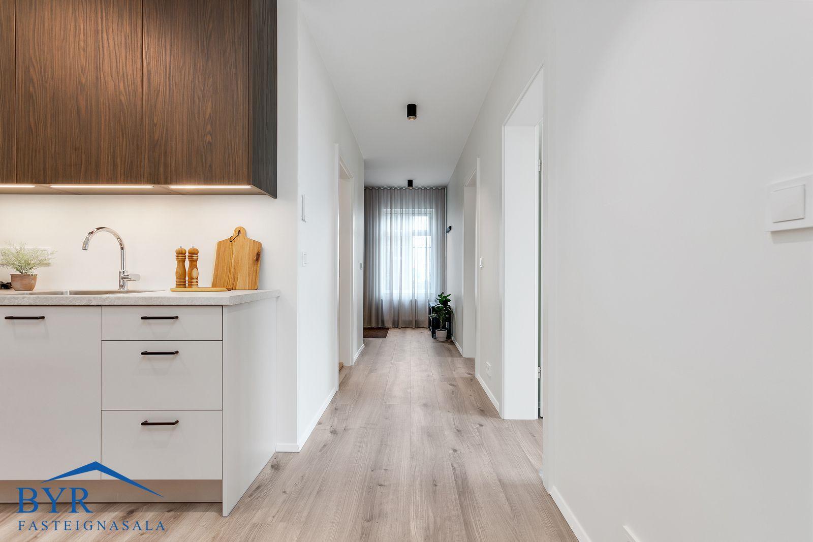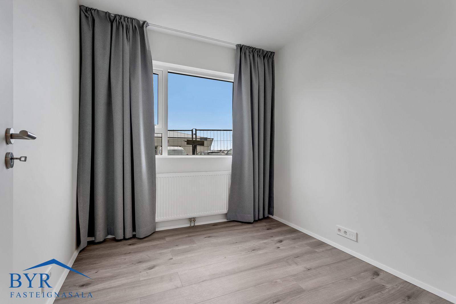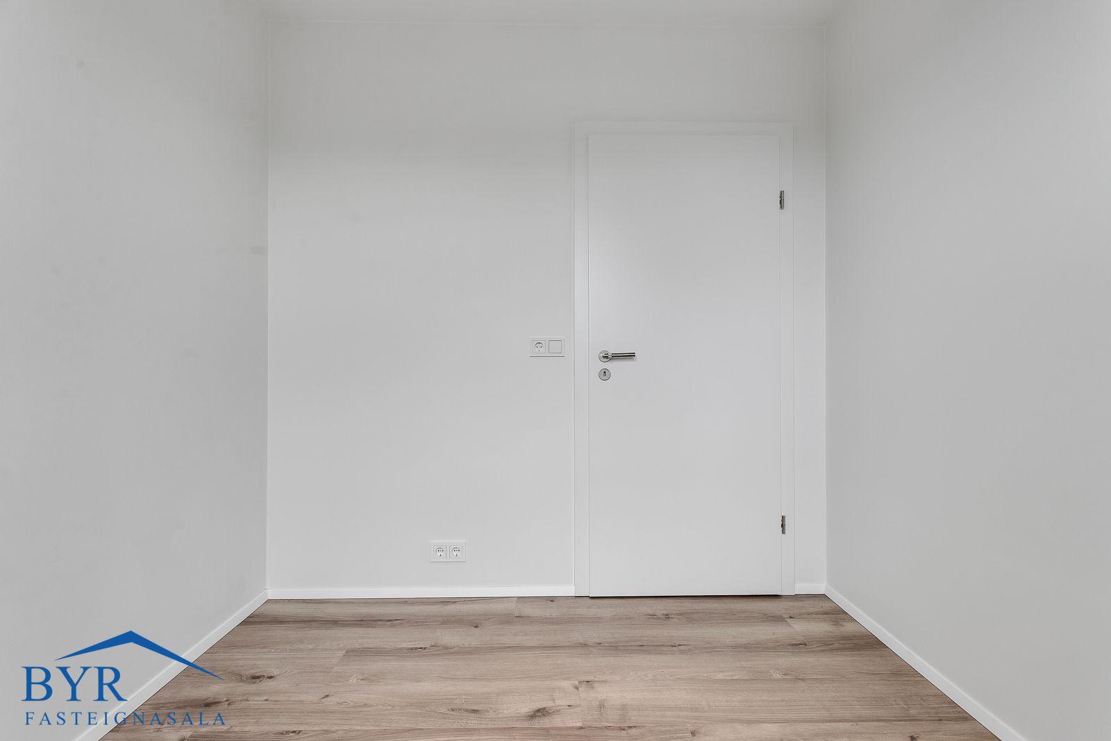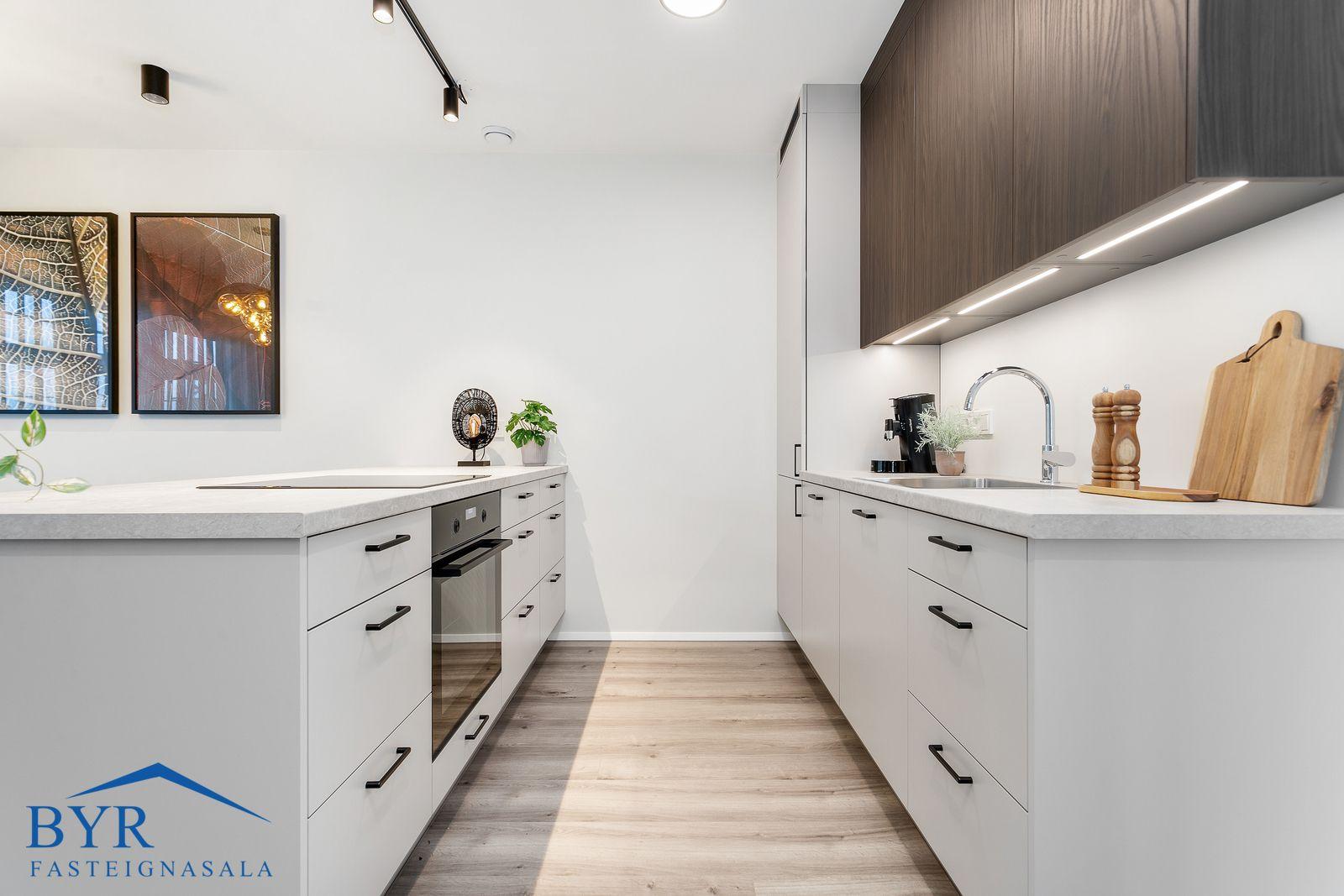 Frágangur og efnisval, allar íbúðir eru fullfrágengnar að innan, gólfefni, innréttingar og heimilistæki:Íbúðirnar eru málaðar í ljósum lit, yfirfelldar innihurðar hvítar frá Parki. Allar innréttingar í eldhúsum, baðherbergjum, þvottahúsum ásamt fataskápum eru sérsmíðaðar frá Voké-III innréttingum, ljósar á lit í bland við dökka viðaráferð, heimilistæki AEG frá Rafha innbyggður ísskápur og uppþvottavél. Öll gólfefni verða frá Álfaborg, flísar á baði 60x60 á gólfi og tveimur veggjum í sturtu, harðparket ásamt hvítum gólflistum. Háhraða ljósleiðari frá Mílu tilbúinn til tengingar.