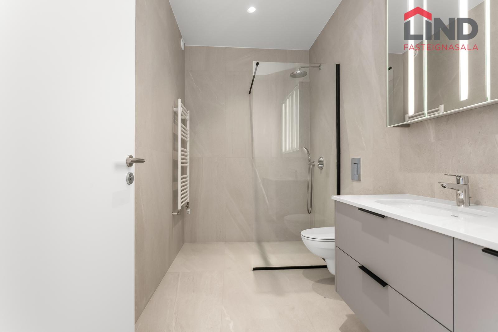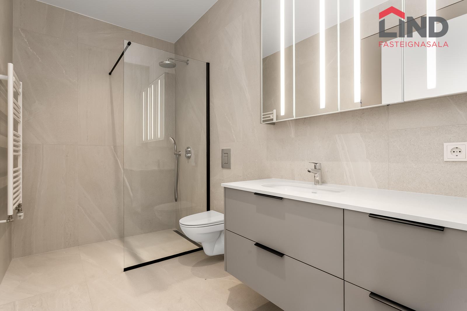 Baðherbergi: Gráar flísar 60x120 að stærð á gólfi og á veggjum að hluta. Borðplötur eru úr 20 mm Quartz steini með undirlímdum vaski. innréttingin er frá Selós, framhliðar eru matt beige og grábrúnar að lit. Upphengt salerni, handklæðaofn og sturta. Hreinlætistæki eru frá Grohe og innihalda hitastýrð og innbyggð blöndunartæki í sturtu. Þvottaaðstaða er inn á baðherberginu, með innréttingu frá Selós undir þvottavél og þurrkara, beige og grábrún að lit. Vélrænt loftræstikerfi er í öllum íbúðum, og loftræstisamstæða er staðsett í efri skáp þvottainnréttingarinnar.
