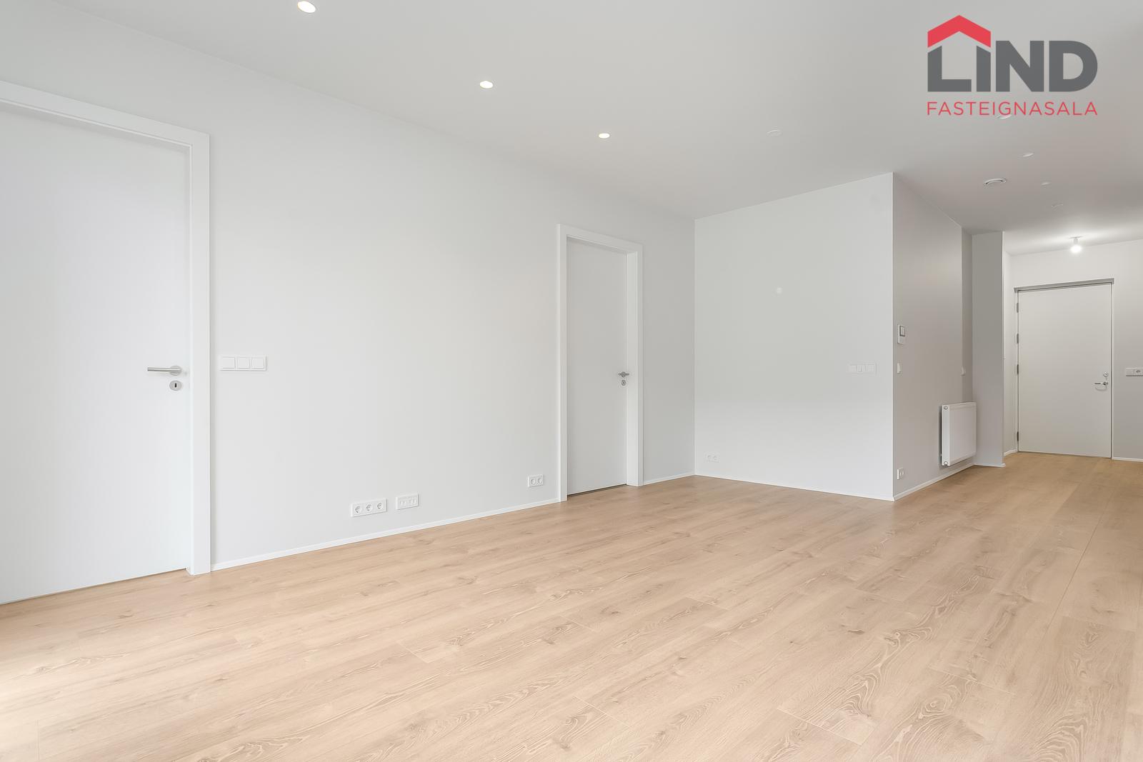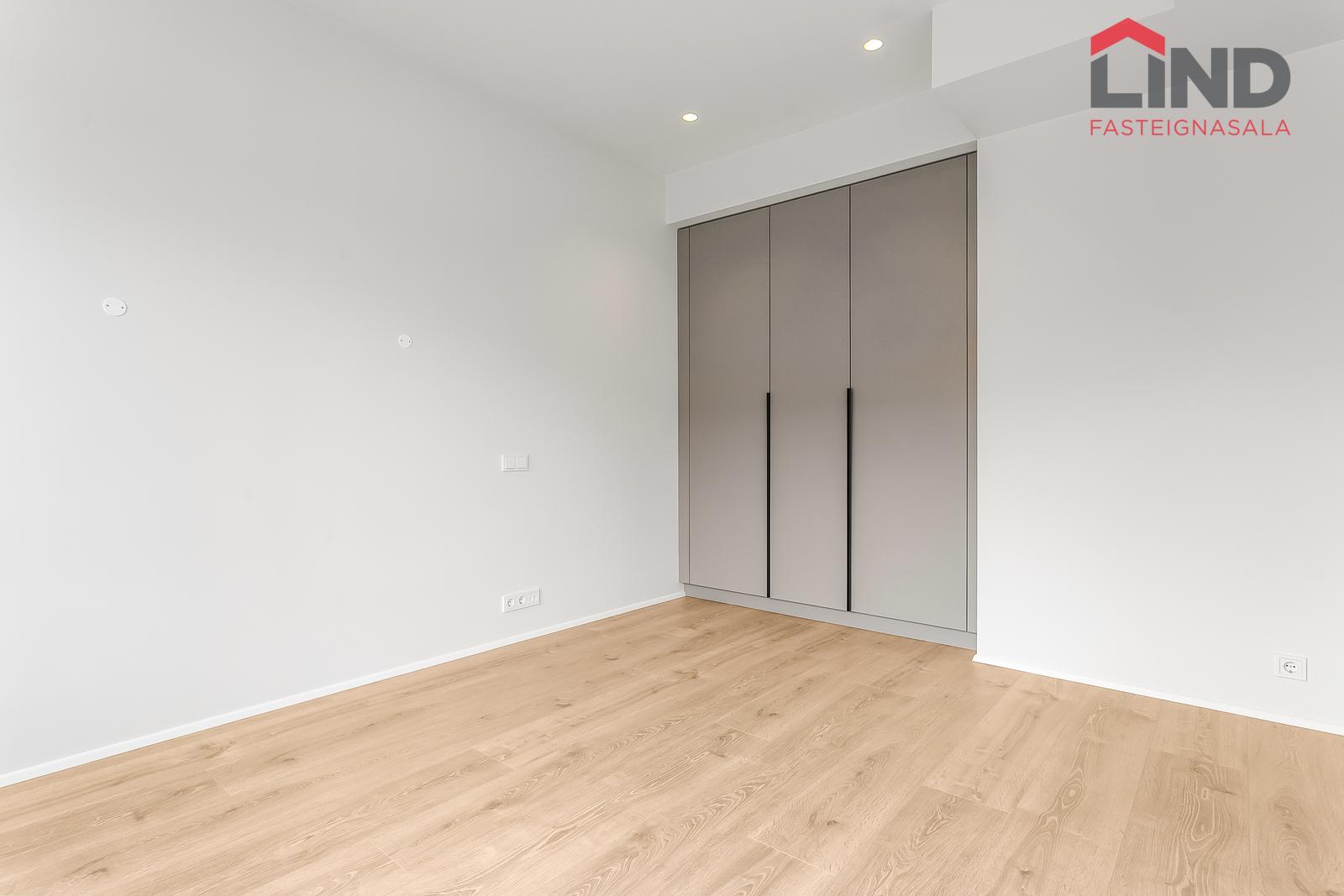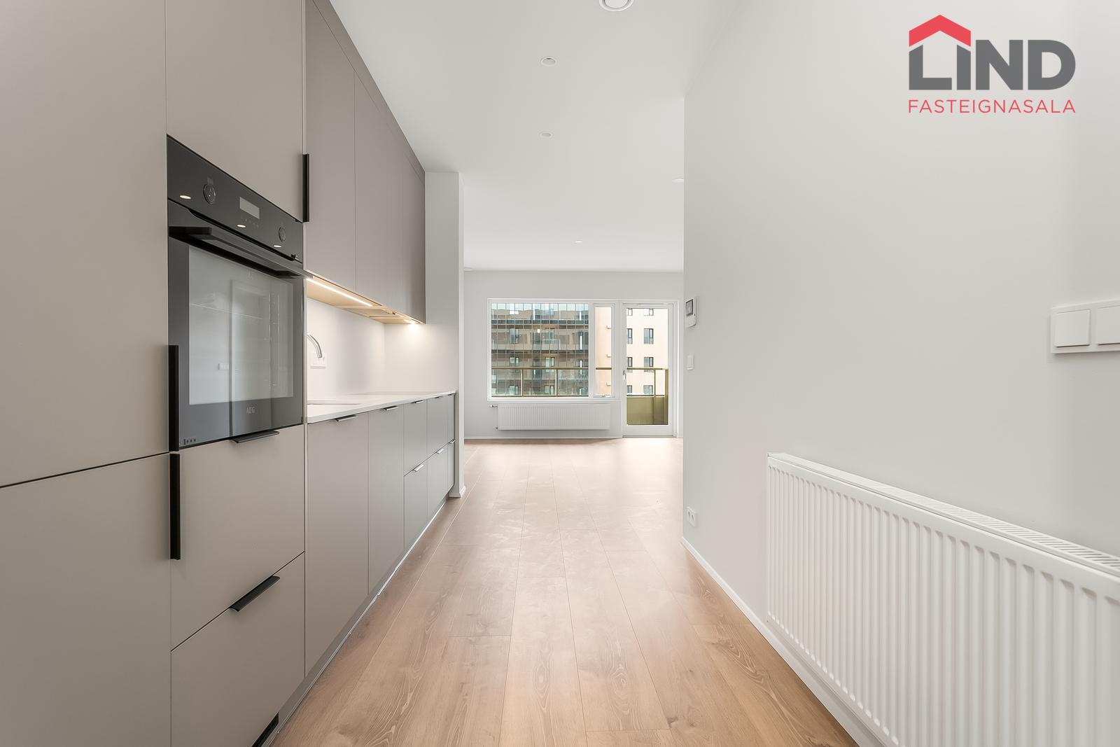 Eldhús: Parket á gólfi, gott skápa- og borðpláss, innréttingin er frá Selós, framhliðar eru matt beige, grábrúnar að lit, borðplötur eru úr 20mm Quartz steini með undirlímdum vaski úr stáli. Eldhústæki eru frá AEG. Innbyggður ísskápur, frystir og uppþvottavél fylgir. Skúffur eru með mjúklokunarbúnaði, og LED lýsing undir efri skápum. Höldur eru svartar grip höldur frá Selós.