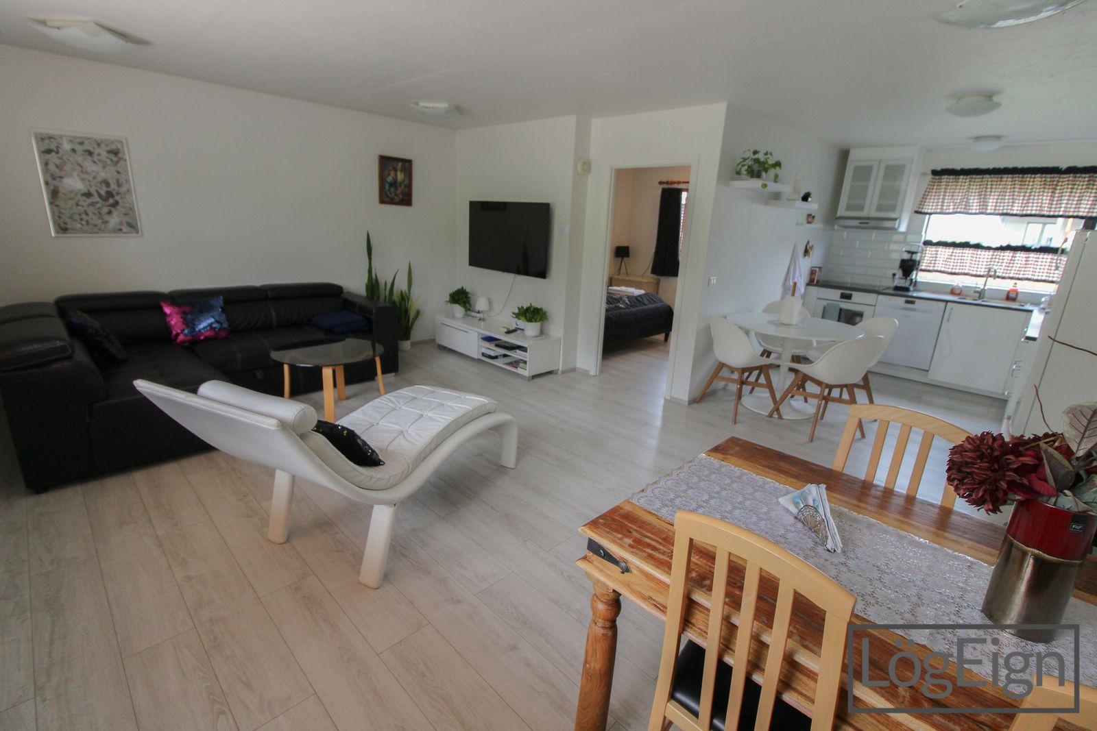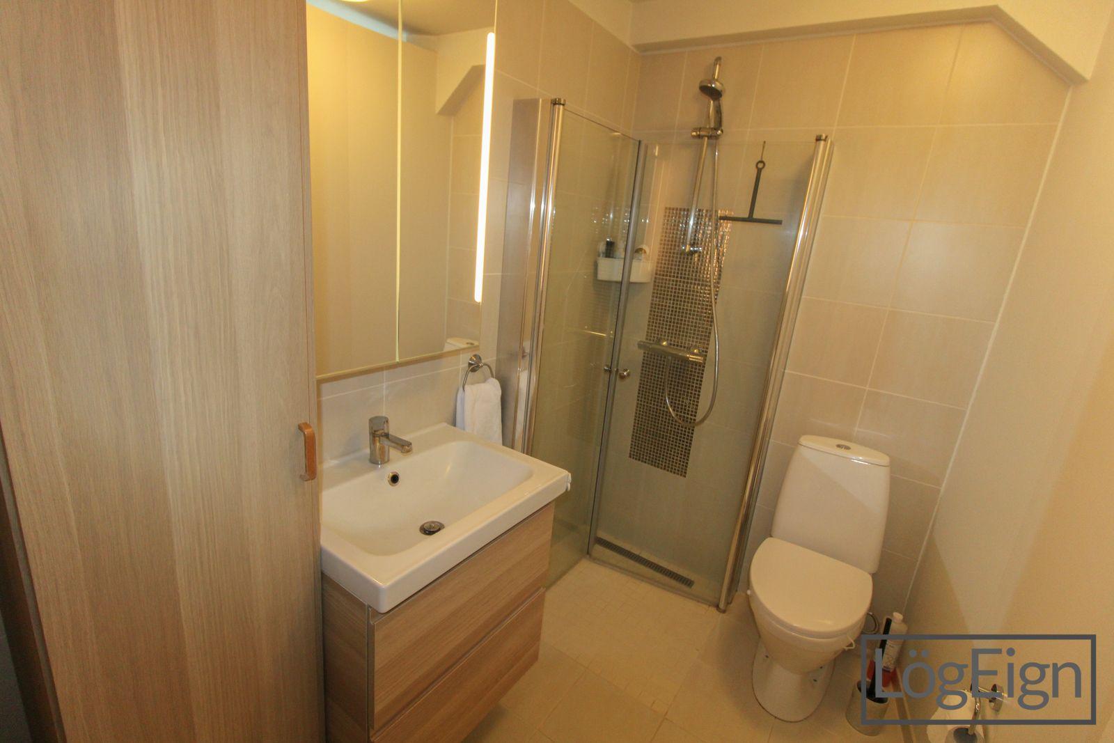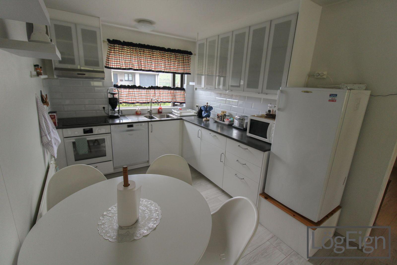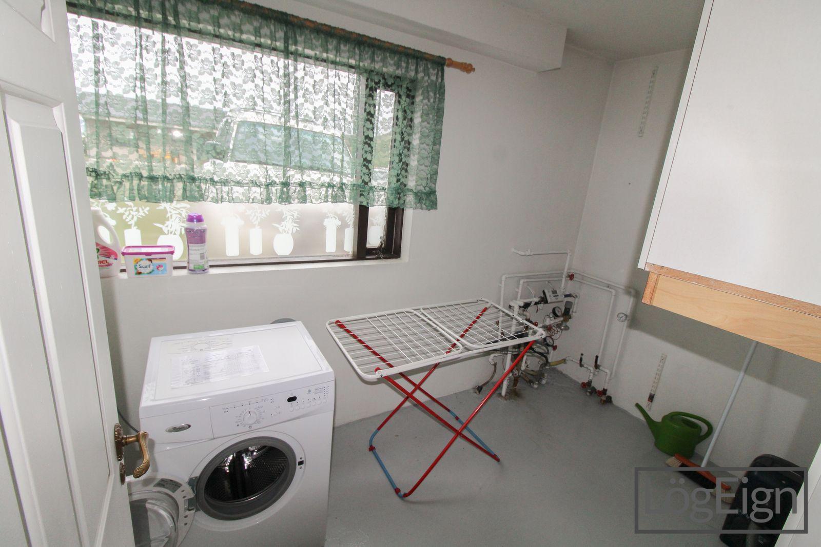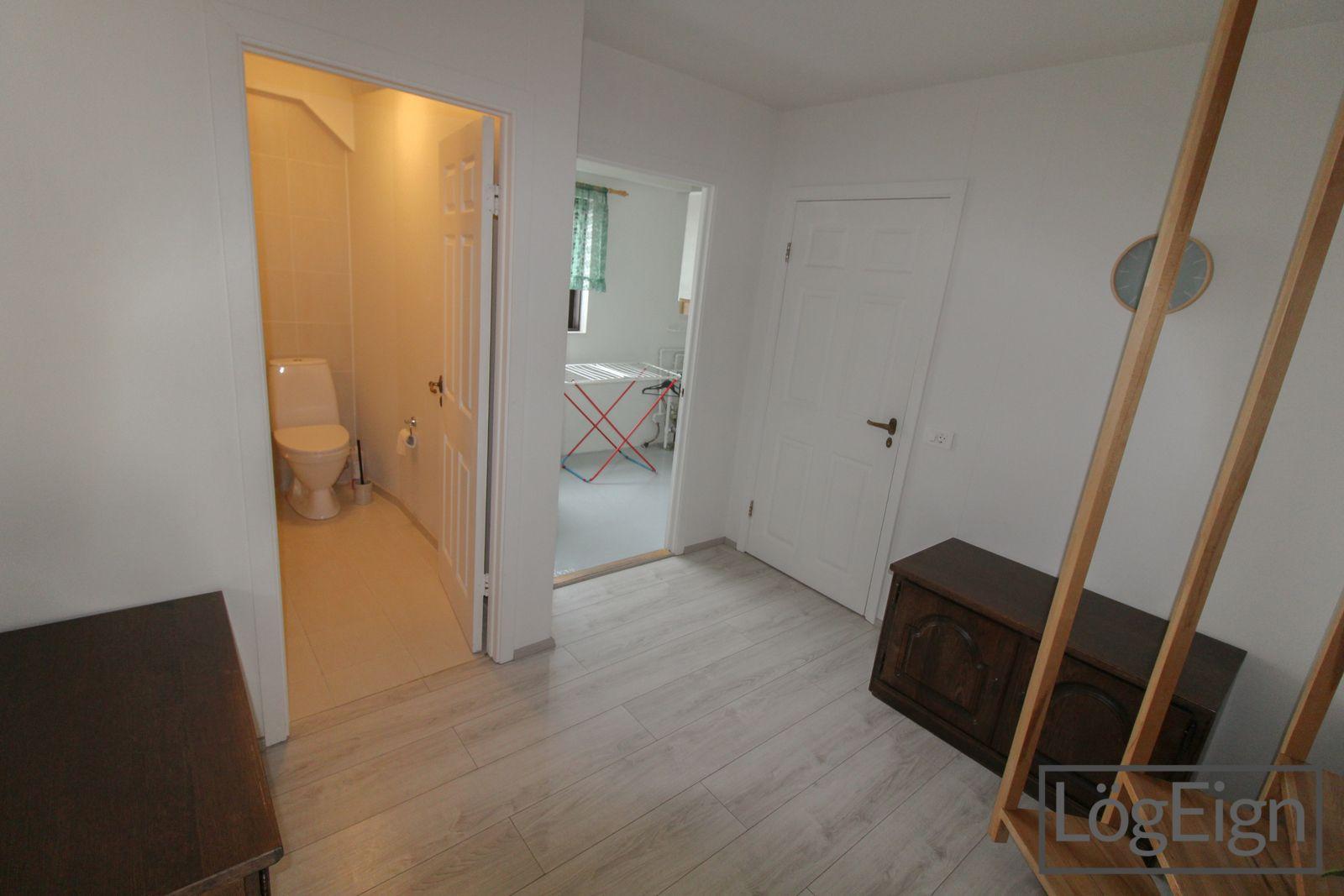inn af forstofunni er parketlagt hol sem tengir saman svefnherbergi, baðherbergi og stofu, einnig er stigi upp á efri hæð eignarinnar staðsettur þar en búið er að klæða fyrir stigaopið. Baðherbergið er flísum á gólfi og á veggjum í votrými, viðarlituð innrétting, sturta og wc. þvottahúsið er með epoxy lökkuðu gólfi og lagnagrindin er einnig staðsett þar. Stofan er rúmgóð og nýtist bæði sem borðstofa og sjónvarpsstofa, eldhúsið er síðan í opnu rými með stofunni. Eldhúsið er með hvítri innréttingu bæði með efri og neðri skápum og flísalagt á milli skápa, gert er ráð fyrir uppþvottavél í innréttingunni og pláss fyrir ískáp við endan á innréttingu. Tvö svefnherbergi sem eru bæði nokkuð rúmgóð og eitt með fataskáp.
