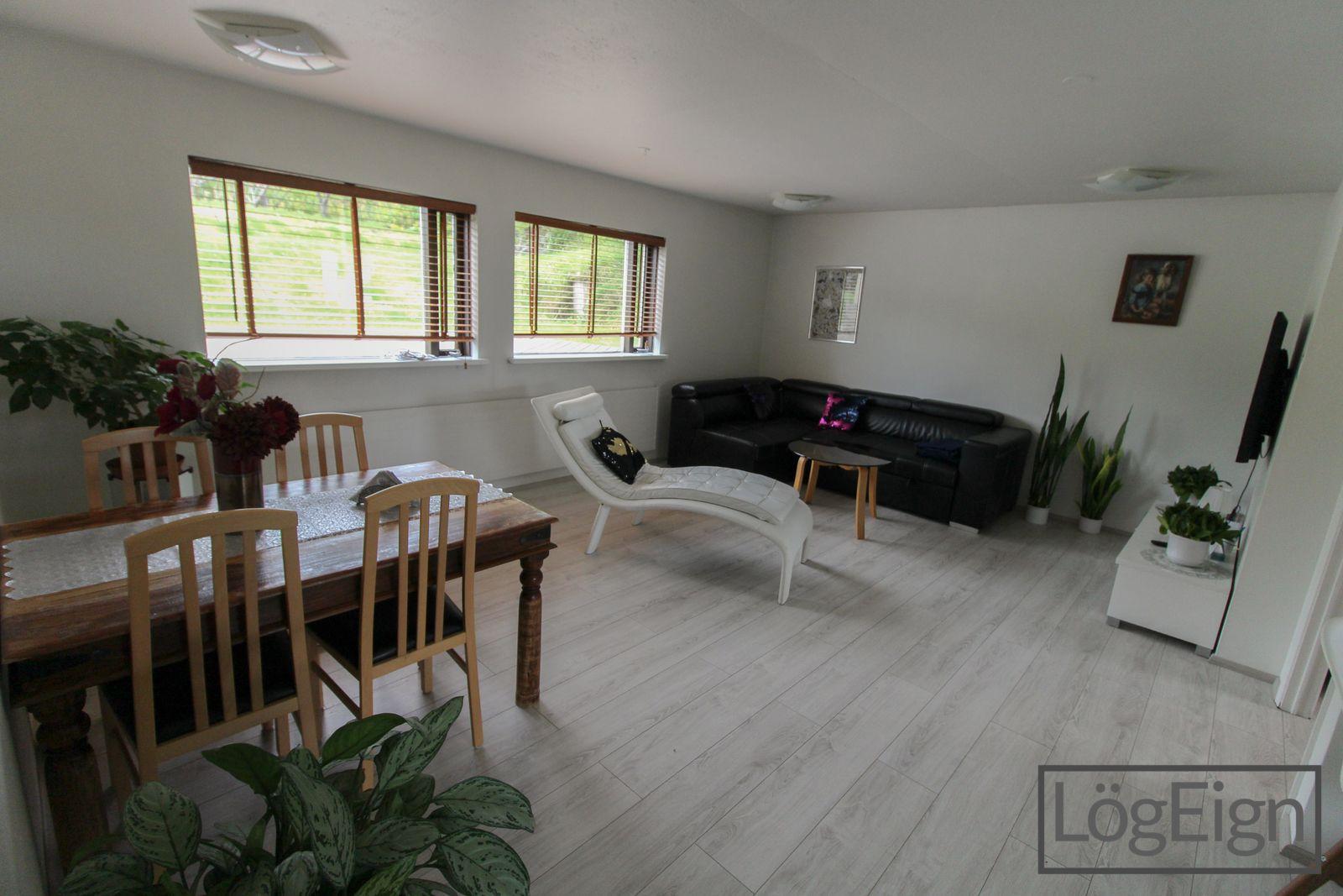 Efri hæð:komið er inn í flísalagða forstofu, inn af forstofu tekur við rúmgóð stofa, útgengt er út á timburverönd með heitum pott úr stofunni. eldhúsið er inn af stofunni sem er með dúk á gólfi, hvítri innréttingu með bæði efri og neðri skápum og svo er búr inn af eldhúsinu. Baðherbergið er með flísum á gólfi, sturtubaðkari, wc, innréttingu og tengi fyrir þvottavél. þrjú svefnherbergi eru á hæðinni, tvö sem eru rúmgóð og svo eitt aðeins minna.