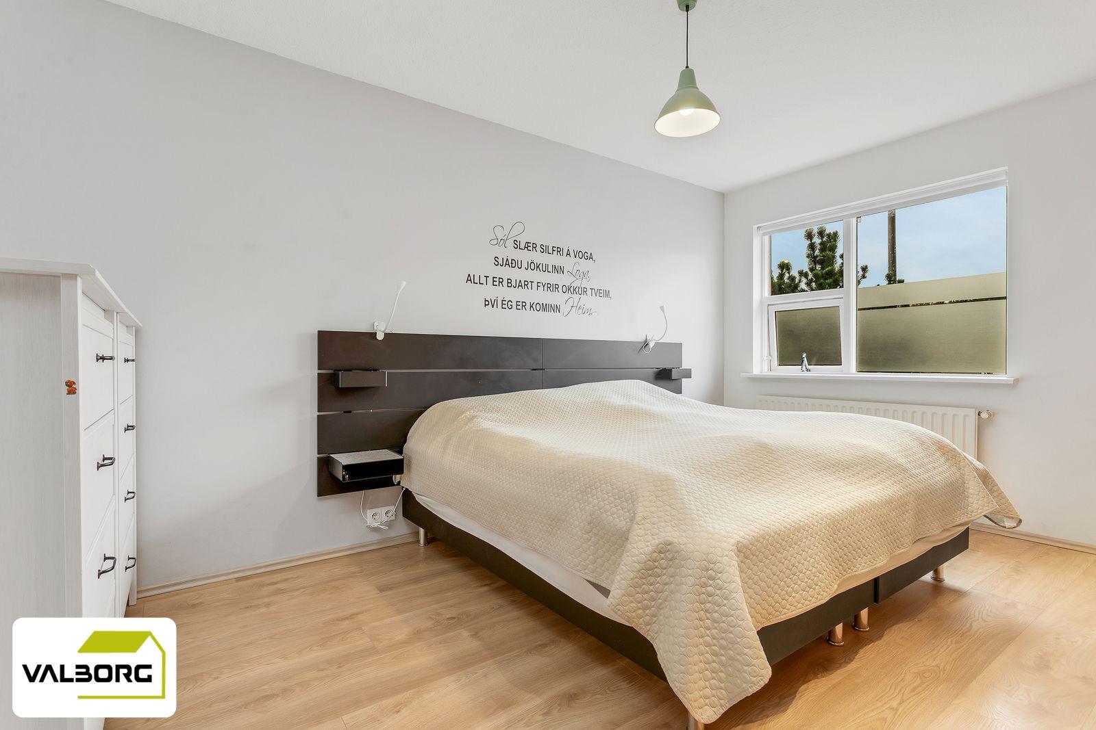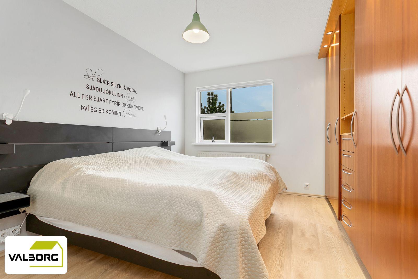 Hjónaherbergi: Góður fataskápur. Parket á gólfi.