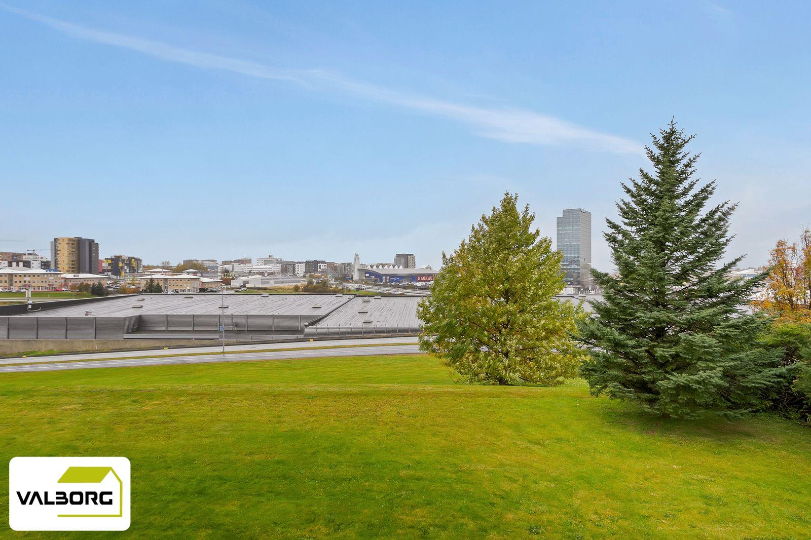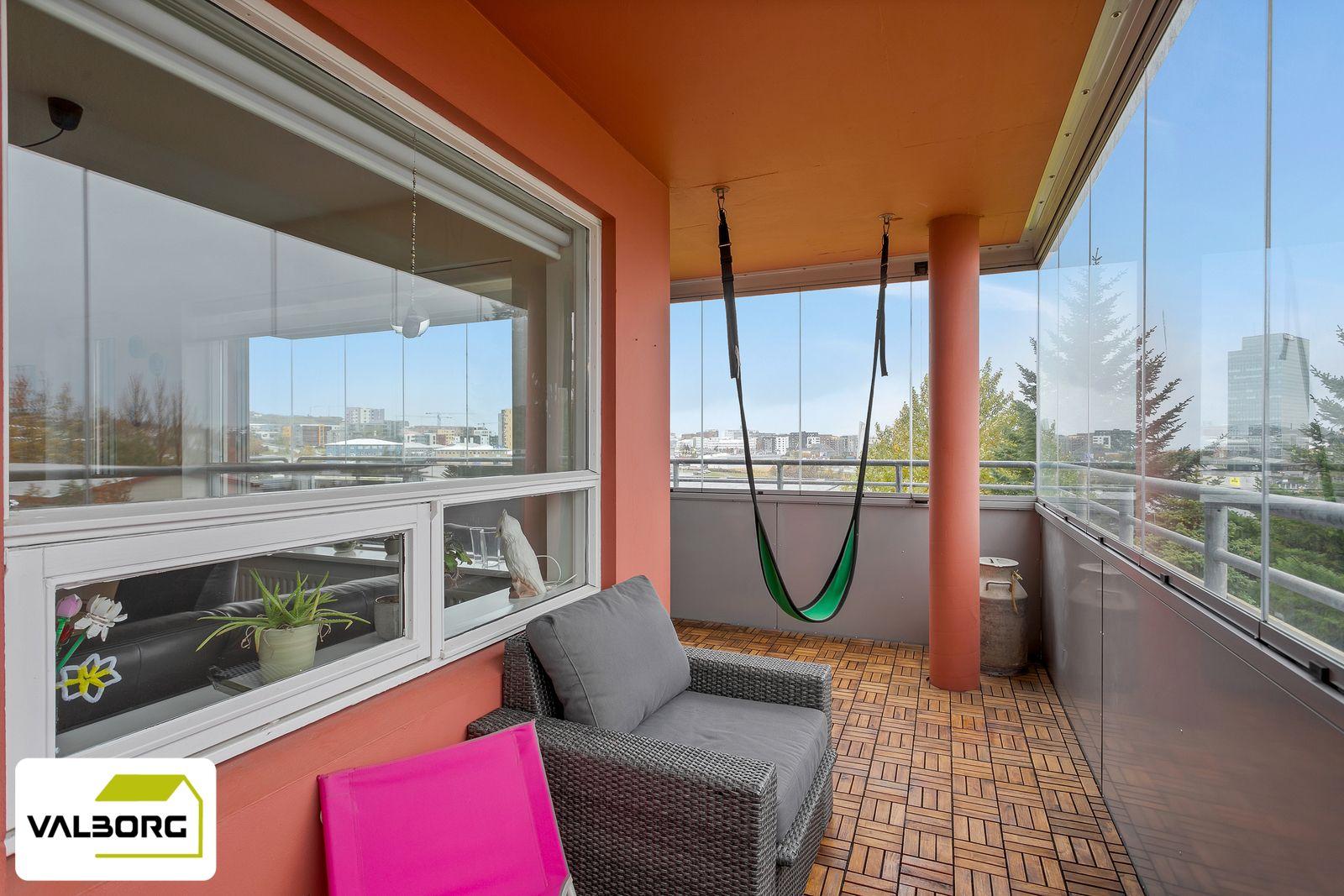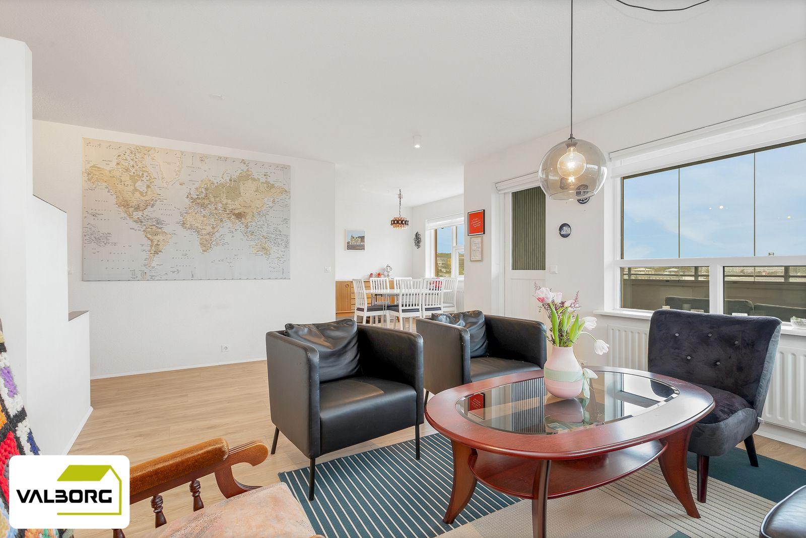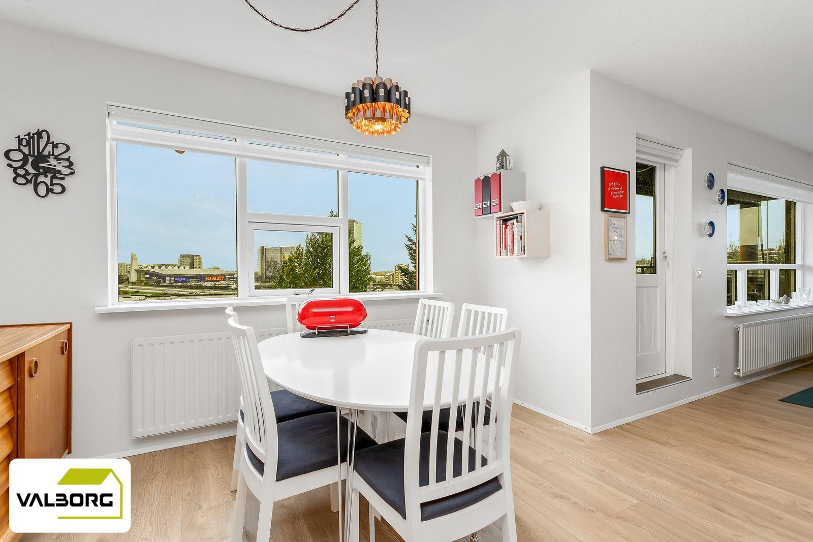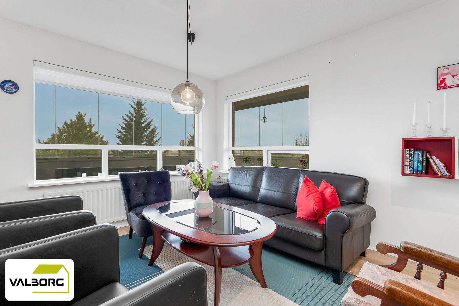 Stofa: Björt, opin stofa með útgengt á suðvestur svalir með fallegu útsýni. Rúmgóðar svalir með nýlegri svalalokun.