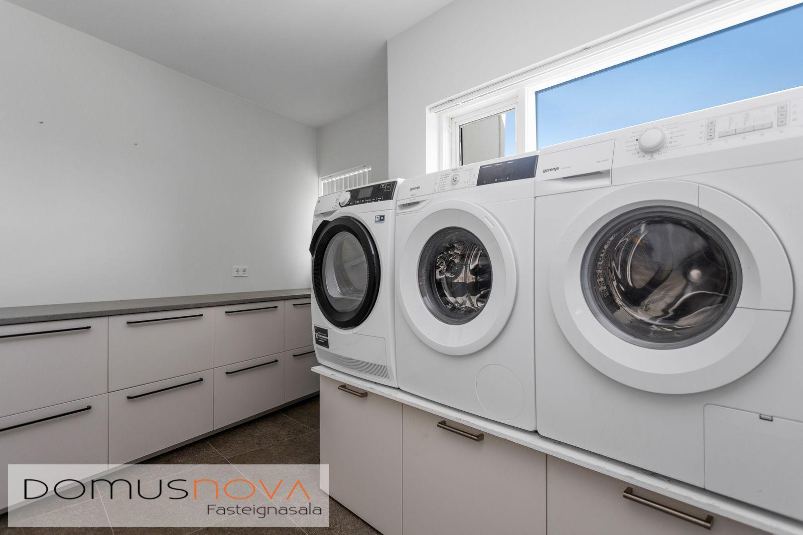 Þvottahús: Virkilega rúmgott þar sem búið er að breyta frá teikningu og sameina geymslu og þvottarými í eitt gott 13,5 fm rými. Gott vinnurými og borðpláss og rými fyrir tvær þvottavélar og tvo þurkara. Flísar á gólfi í þvottahúsi.