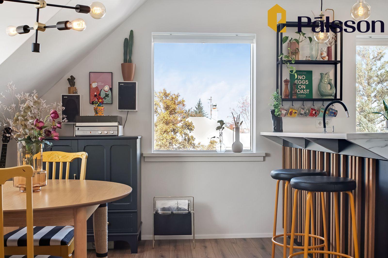 stofa eru með glugga í tvær áttir, virkilega skemmtilegt rými sem er opið með eldhúsi.