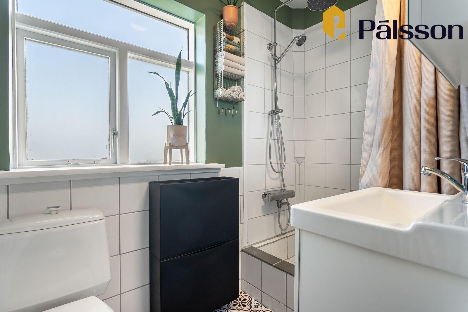 Baðherbergi er flísalagt með wc, innréttingu með handlaug og flísalögð sturta.
