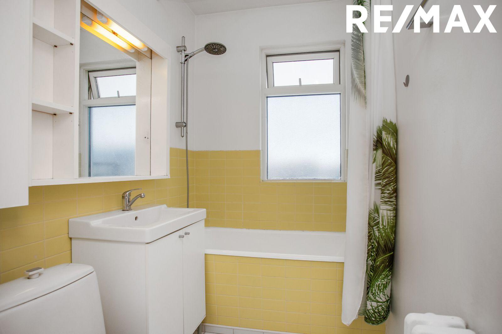 Baðherbergið með innrétttingu, baðkari með sturtuaðstöðu. Flísar á gólfi og gluggi fyrir loftun.