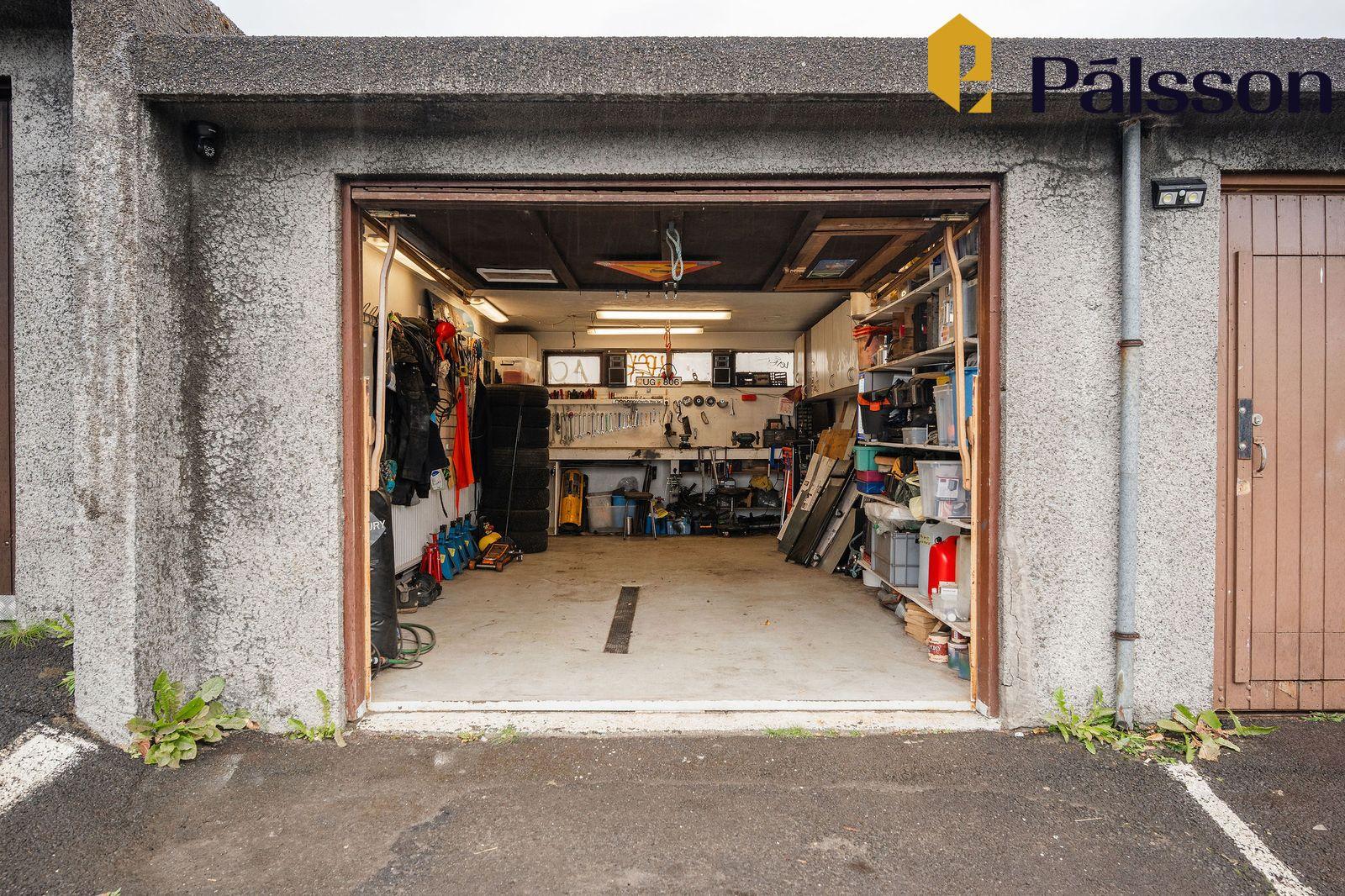 Bílskúr (25,9 m²) með rafmagni, heitu og köldu vatni. Steypt málað gólf. Gott geymslupláss. Hillur, skápar og vinnuborð á veggjum og gluggi.