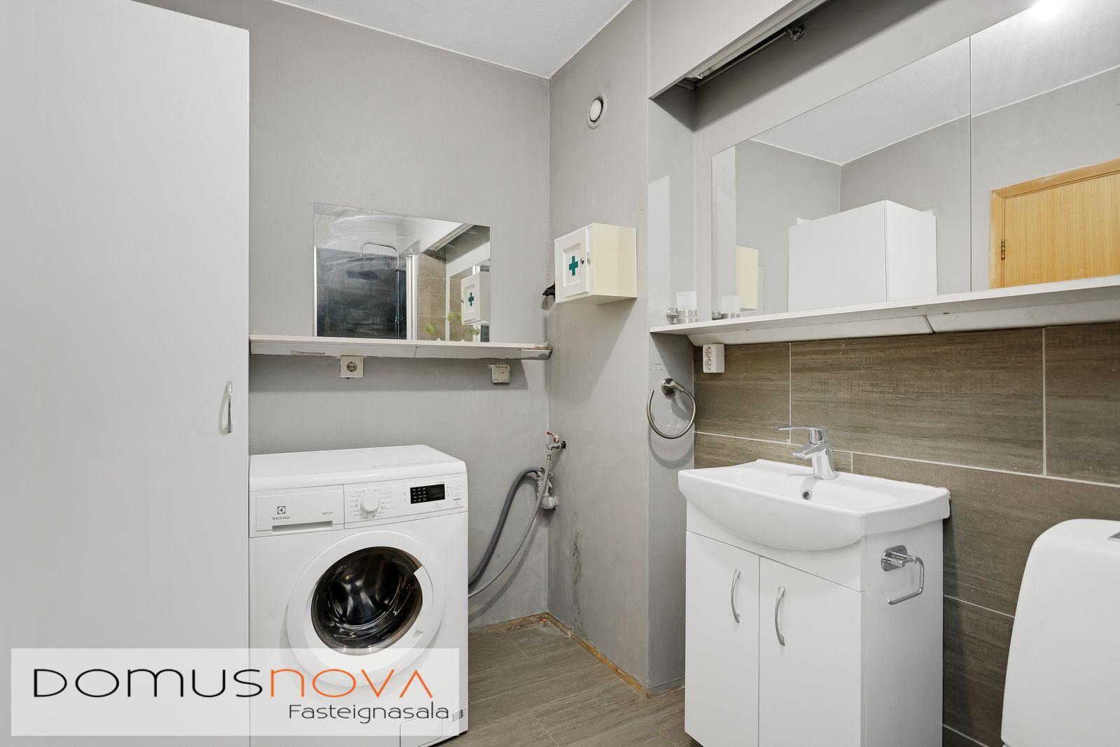 Baðherbergi: Á baðherbergi er sturta, ljós innrétting og tengi fyrir þvottavél og þurrkara. Gráleitar flísar á gólfi og vegg í sturtu.