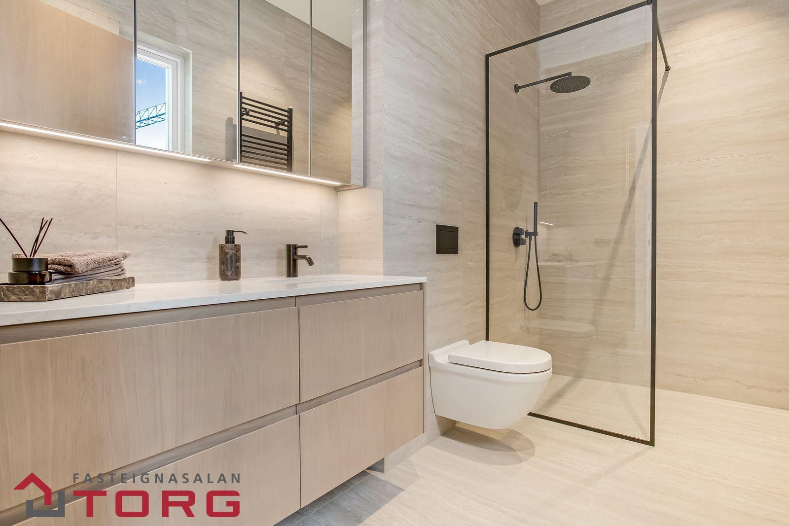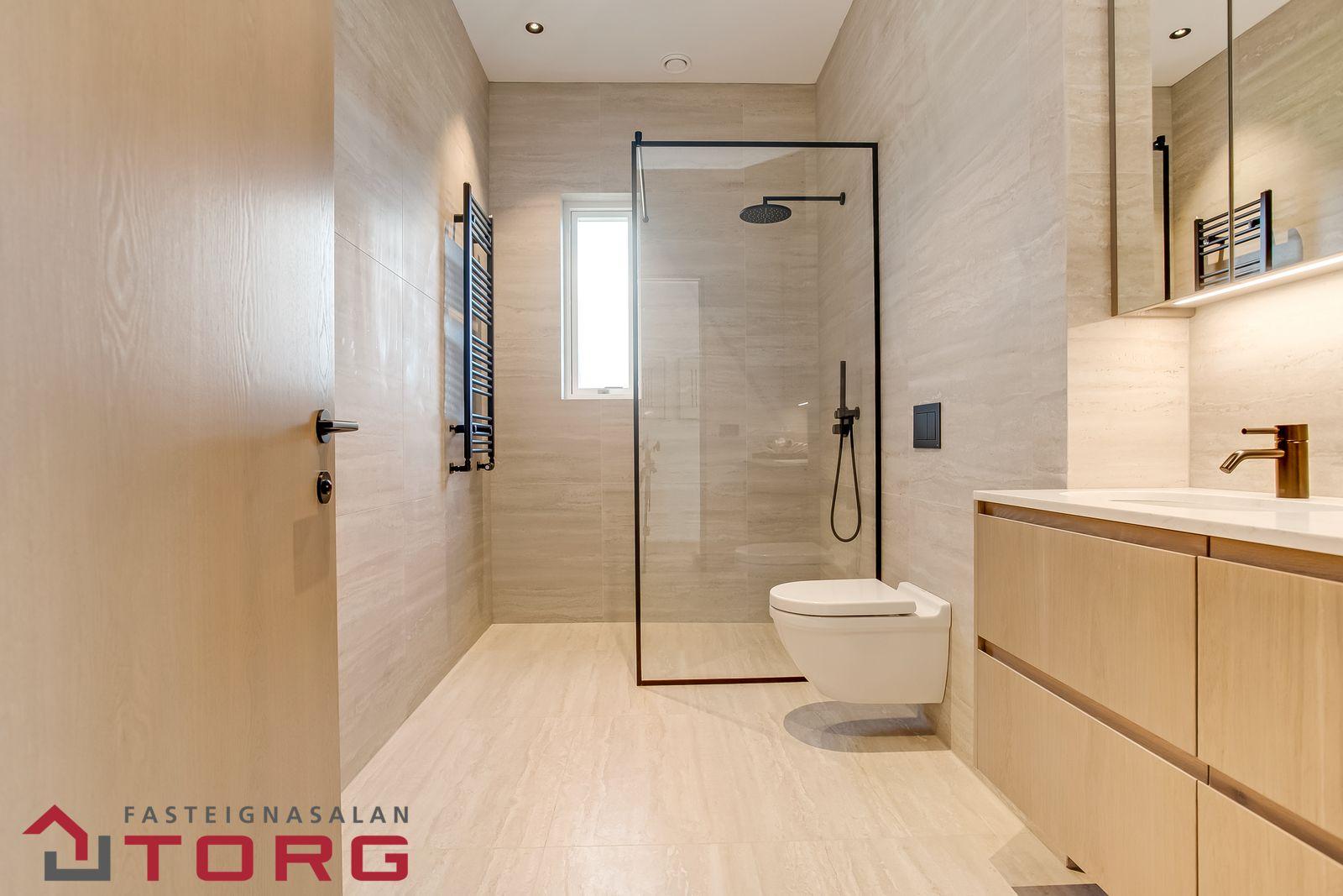 UtanhússfrágangurKlæðning: Flísar og álklæðning (báru og slétt), náttúrulegir jarðlitir.