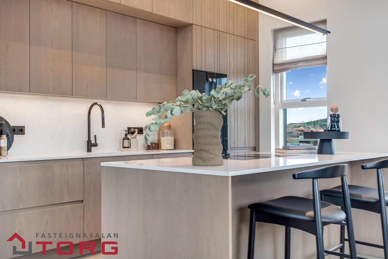 Kvarts steinn á borðplötum. Vönduð tæki eru í eldhúsi; innbyggður Siemens ísskápur, uppþvottavél. Gaggenau ofn og sambyggður ofn/örbylgjuofn (Combi ofn) í vinnuhæð, helluborð með innbyggðri viftu. Eldhús- og blöndunartæki að vandaðri gerð. Íbúðin skilast án gólfefna utan baðherbergja og þvottahús sem skilast flísalögð.