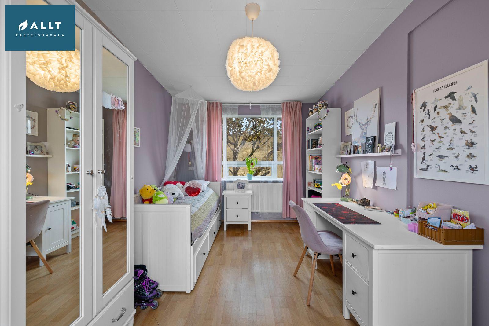 Svefnherbergin eru fjögur og hafa öll parket á gólfi, fataskápur er í hjónaherbergi.