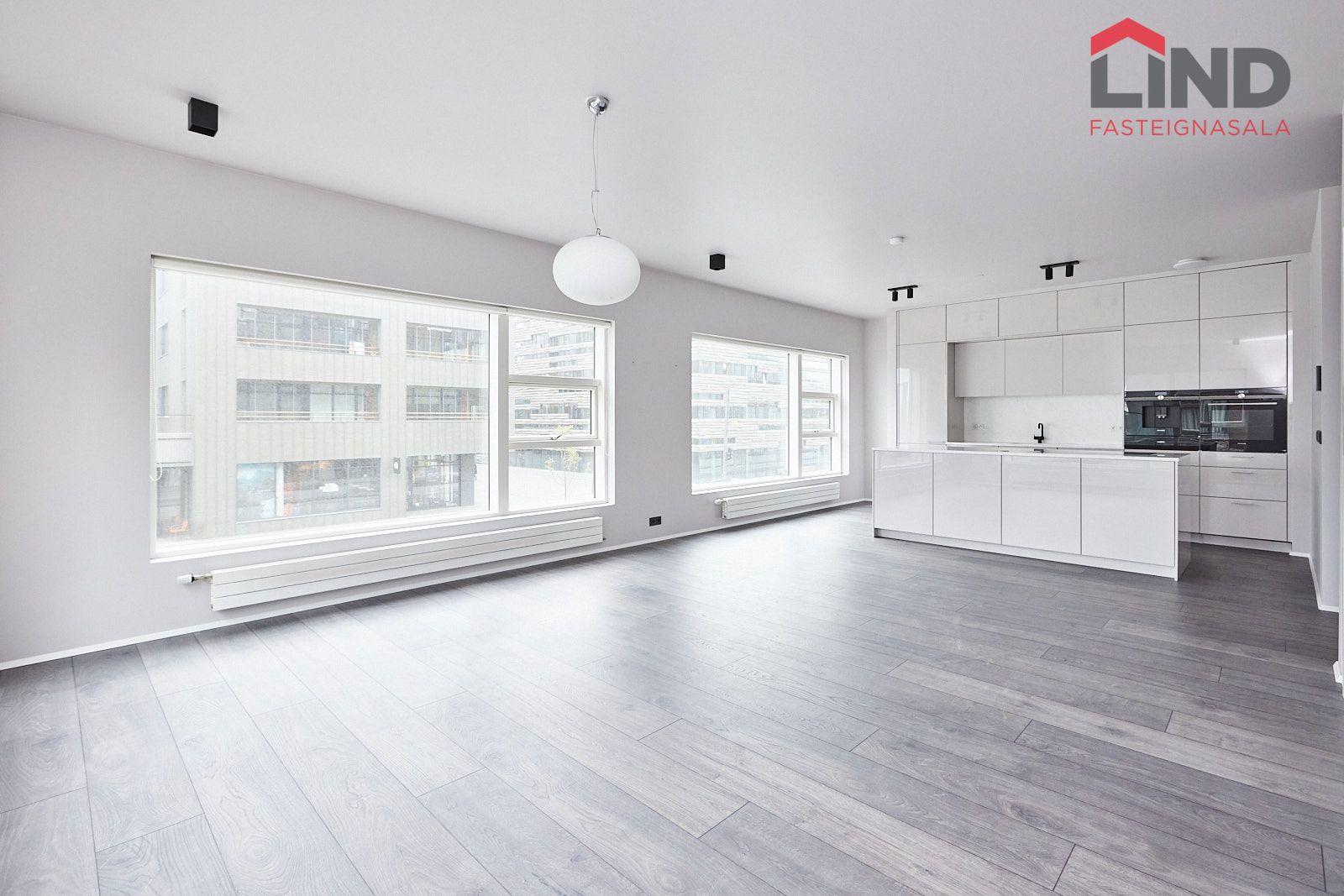 Eignin skiptist í: Anddyri, gang, 2 svefnherbergi, rúmgóða stofu/borðstofu, stóra þakverönd, eldhús með eyju, 2 baðherbergi og þvottaherbergi. Geymsla á jarðhæð.Forstofa: Með harðparketi á gólfi og skápum. Fataskápar eru sprautulakkaðir með innvols frá Innval af vandaðri gerð. Inngangshurð er svargrá með viðaráferð frá Huet.