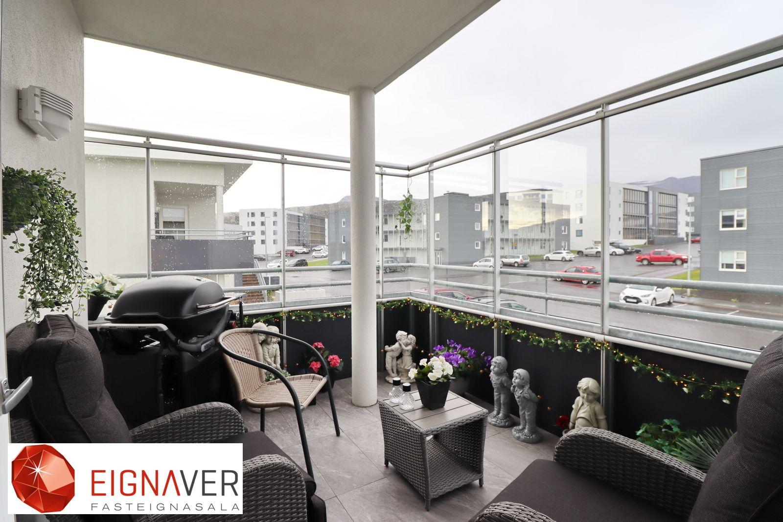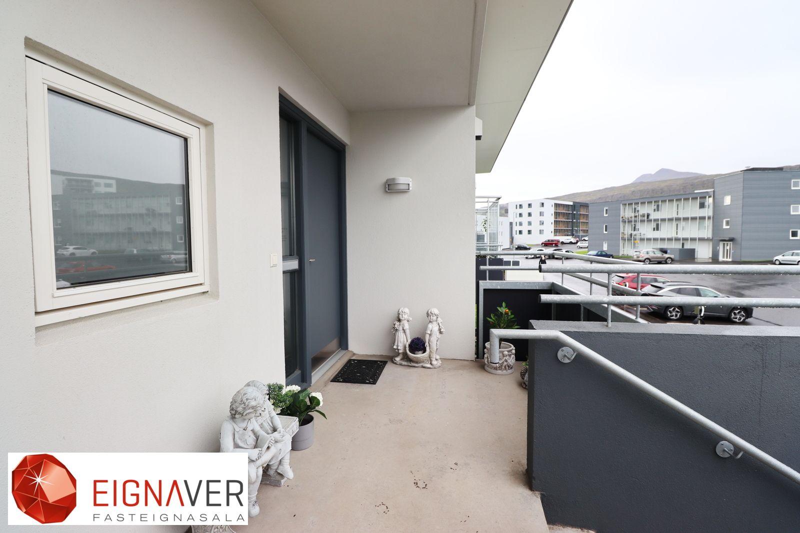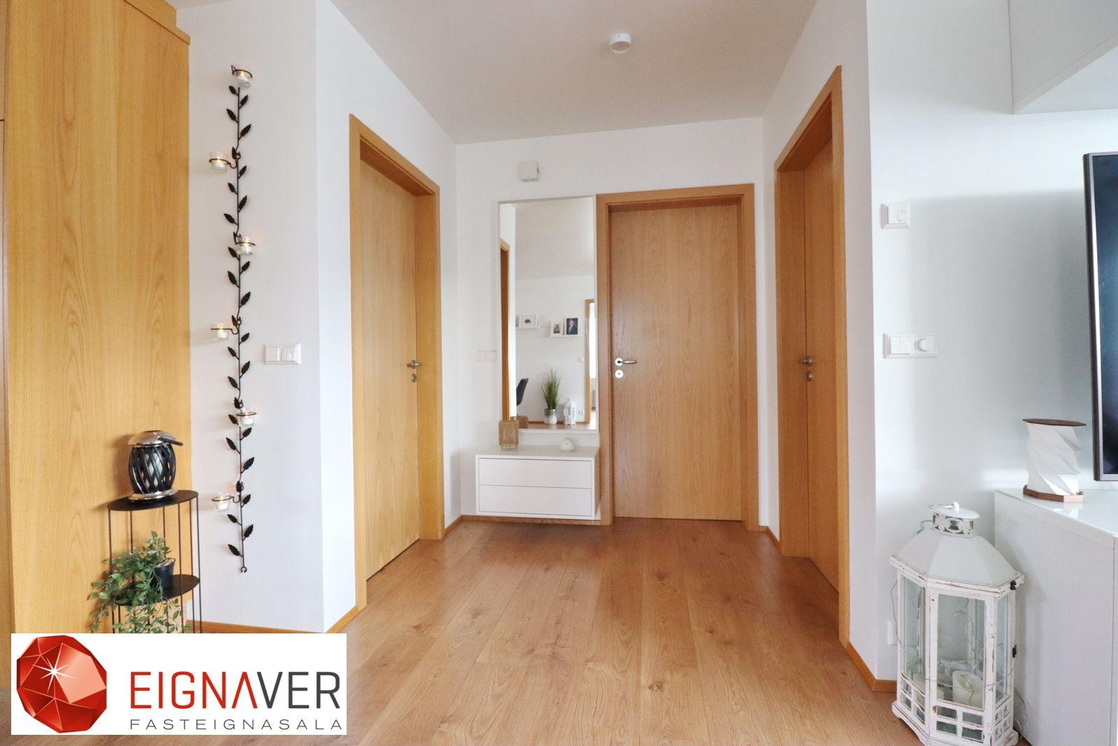 Nánari lýsing: Forstofa með flísum á gólfi og fataskáp. Þvottahús/Geymsla er innaf forstofu með flísum á gólfi. Góð innrétting þar sem gert er ráð fyrir þvottavél og þurrkara í vinnuhæð. Baðherbergi með flísum á gólfi og veggjum. Sturta með glerhurðum, salerni upphengt og góð innrétting við vask ásamt speglaskápum. Góður skápur. Svefnherbergin eru þrjú, öll eru þau með parketi á gólfi og fataskápar í tveimur þeirra. Eldhús og stofa í opnu rými með parketi á gólfi. Útgengi út á flísalagðar vestursvalir úr eldhúsi, gler skjólveggir Mjög góð innrétting í eldhúsi með góðu skápaplássi og einnig góðu vinnuplássi. Innbyggður ísskápur og uppþvottavél og bakaraofn í vinnuhæð.
