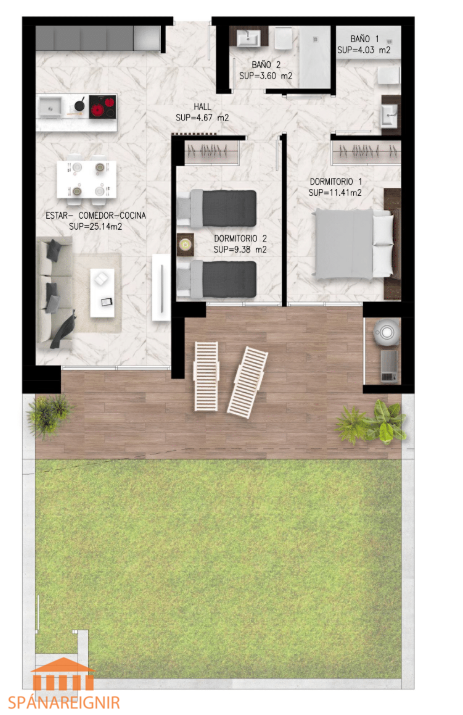 Tvö svefnherbergi og tvö baðherbergi, góð stofa, borðstofa og eldhús í opnu rými. Glæsilegur sameiginlegur sundlaugargarði með góðri aðstöðu og skemmtilegu leiksvæði fyrir börnin.