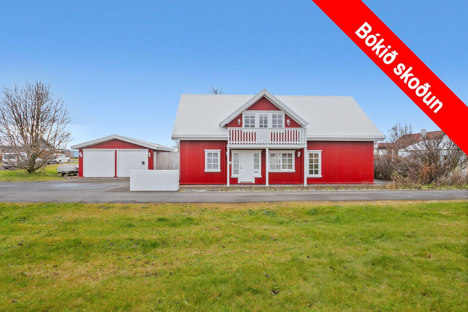 Eignin stendur á stórri eignarlóð sem umlykur húsið sem ávallt hefur hlotið gott viðhald og nýlega er búið að endurnýja glugga á austur og suðurhlið hússins ásamt hurðum. Einnig er búið að endurnýja bárujárn á húsinu að mestu leiti og var þakið yfirfarið og málað í sumar. Nýtt þakjárn er á bílskúr og einnig búið að endurnýja bárujárn þar að hluta.Húsið er skv. Fasteignaskrá Íslands skráð 260,0 fermetrar að stærð á tveimur hæðum að meðtöldum tvöföldum 58,0 fermetra bílskúr og skiptist þannig að íbúðarhúsið er 202,0 fermetrar að stærð, bílskúrinn er 58,0 fermetri og hluti af honum er líkamsræktarherbergi með baðherbergi.
