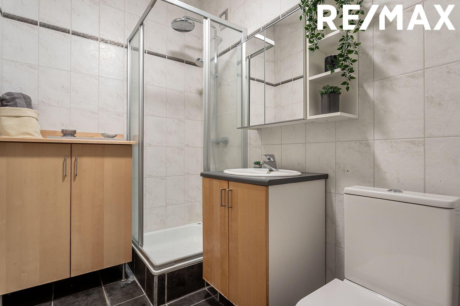 Baðherbergi: Sturtubotn með rennihurðum, flísalagðir veggir. Nýtt gólffest klósett, vaskur með skáp undir og vegg, glerskápur með hillu á vegg.