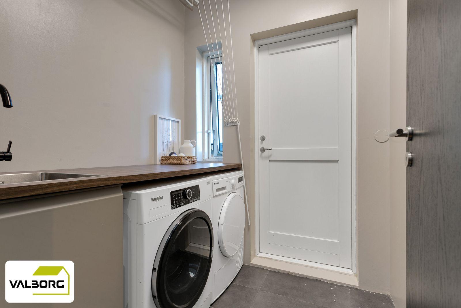 Þvottahús: Rými fyrir þvottavél og þurrkara. Vaskur, frálagsborð og þvottasnúrur. Flísar á gólfi. Útgengt út í lítinn sameiginlegan garð á bakvið.