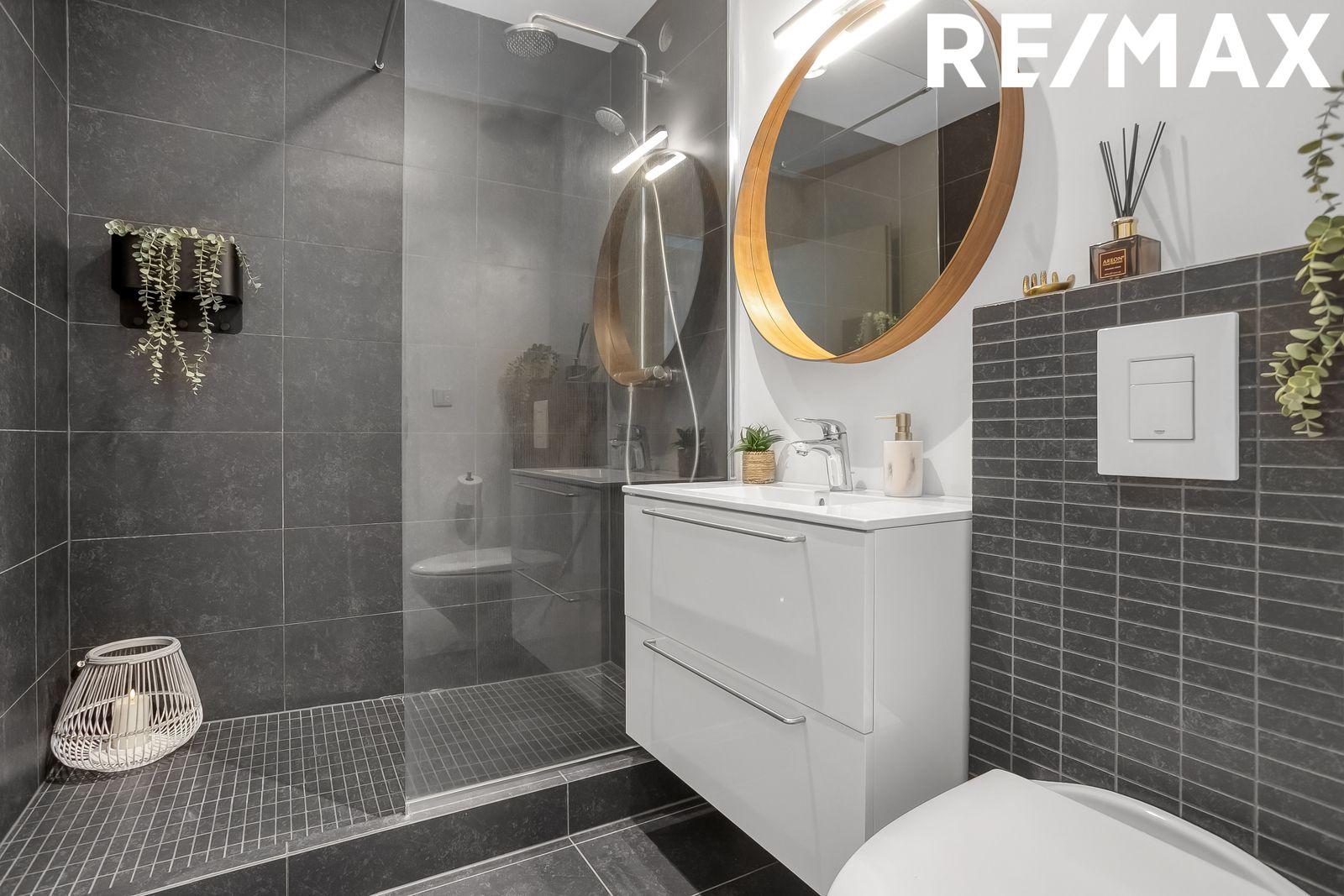 Baðherbergi: Flísalögð walk-in sturta með glæru sturtugleri. Upphengt salerni og handlaug í hvítri innréttingu með 2 skúffum. Gólfflísar eru á hluta veggja, salerniskassa og gólfi.