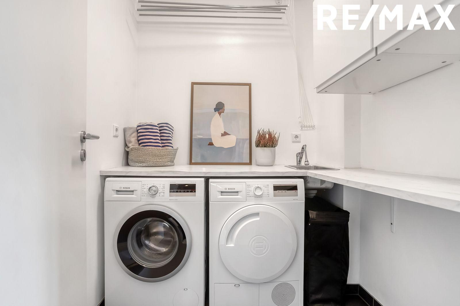 Þvottaherbergi: Tengi fyrir þvottavél og þurrkara, stálvaskur er í borðplötu sem er L- laga. Vegghengdur skápur og snúruhengi í lofti ofan borðplötu.