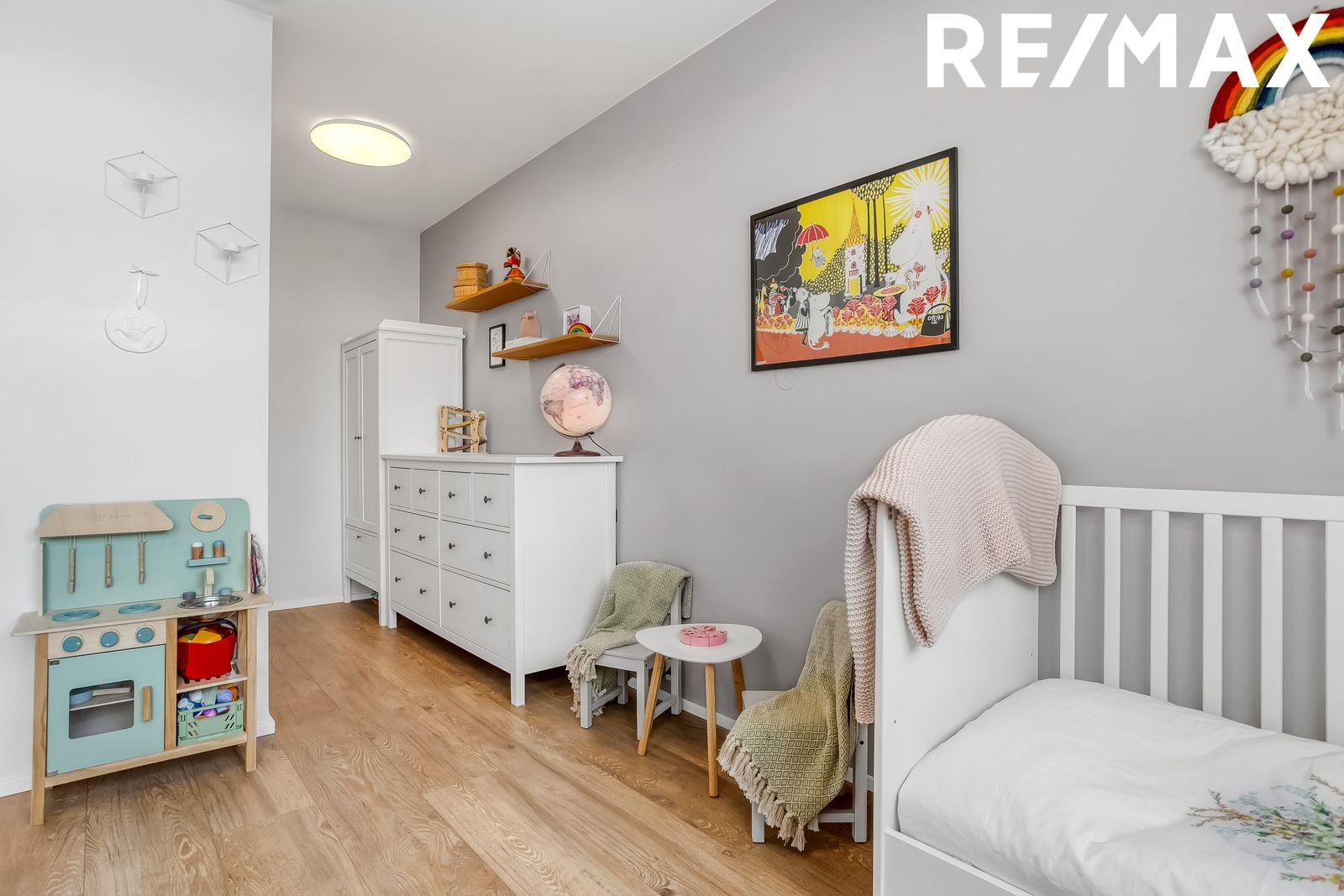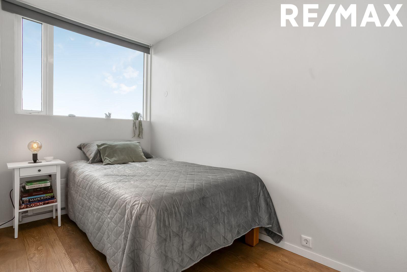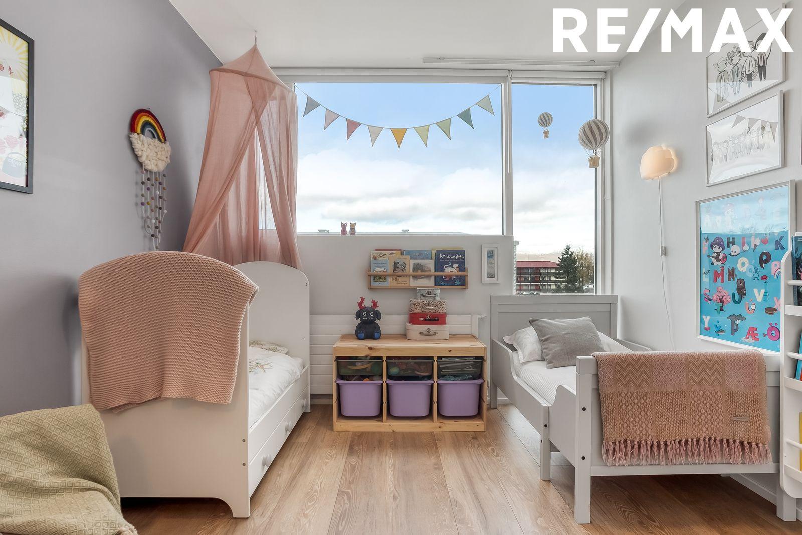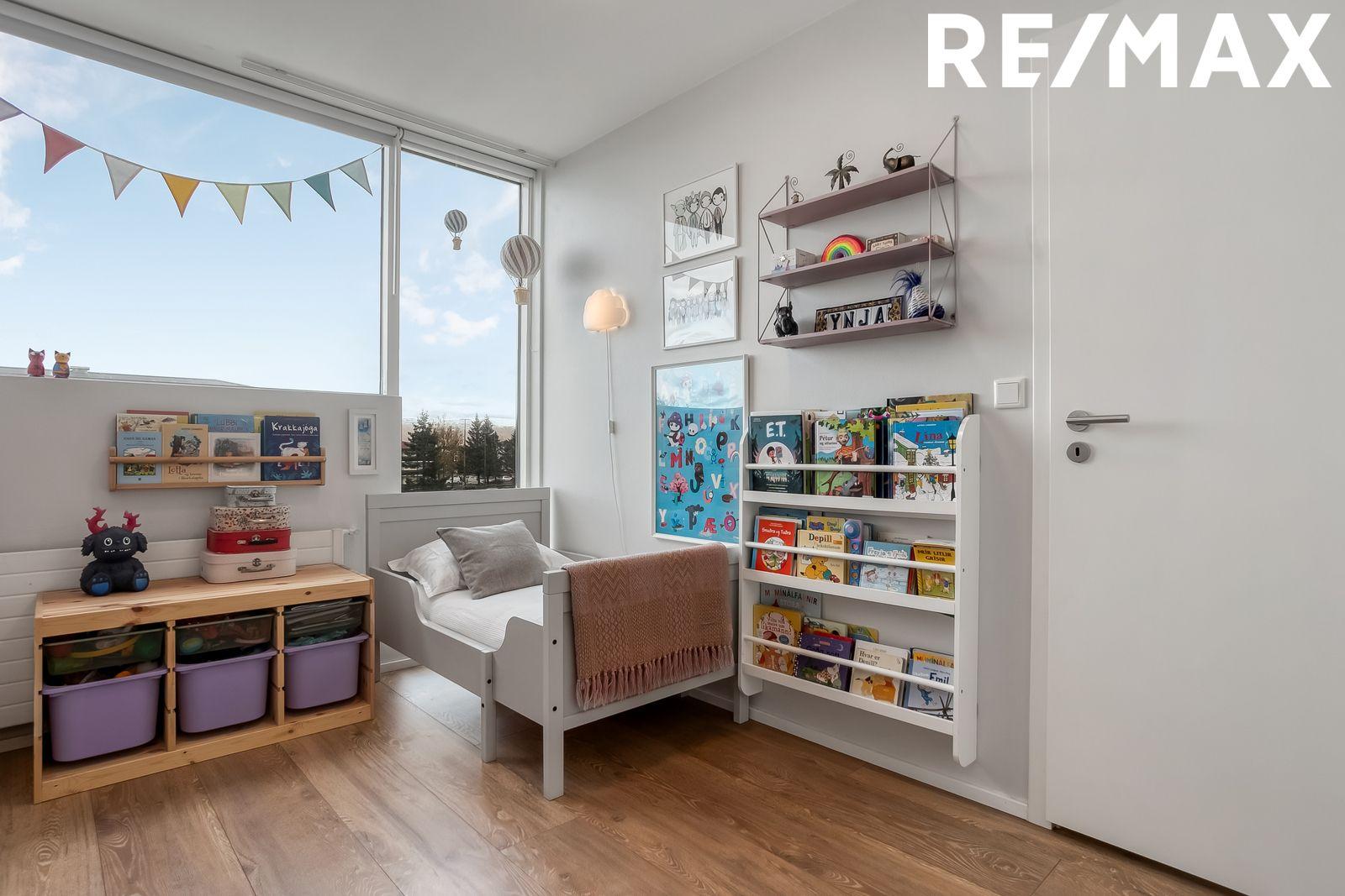Herbergi 2: Rúmgott með gluggum á einum vegg og er hluti gluggans hólf í gólf. Útskot er í herberginu sem getur nýst sem nett fataherbergi eða fyrir rúm/vinnuaðstöðu.