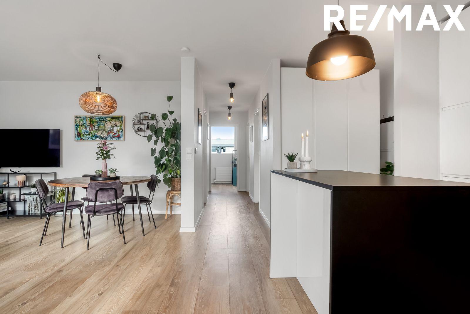 Fallegar hvítar innréttingar og fataskápar frá IKEA, harðparket frá Birgisson á gólfum, dökkar flísar og mosaík flísar á baði og þvottahúsi. Innihurðar eru hvítar, yfirfelldar frá Parka.