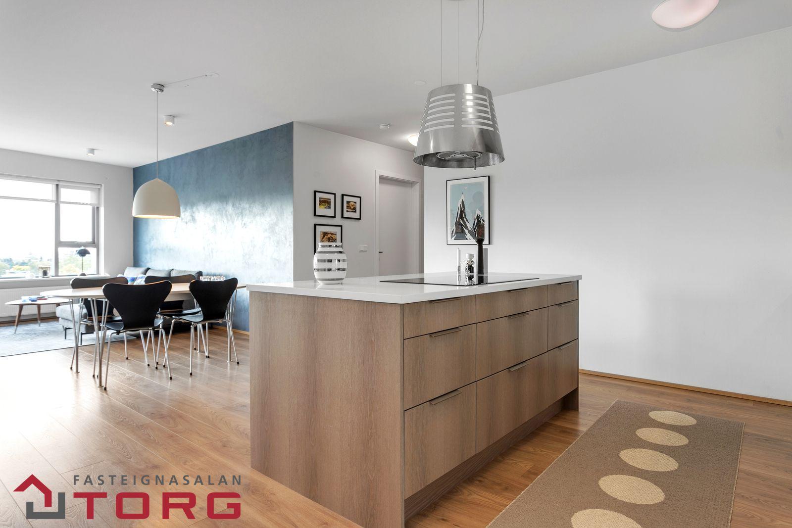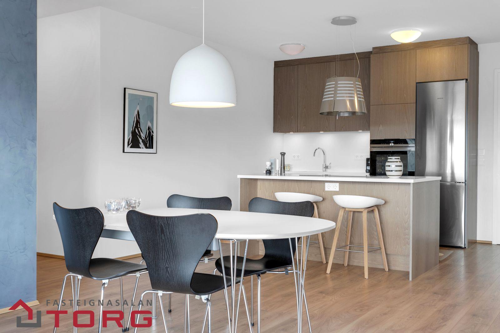 Eldhús: Eldhúsið er fallegt með ljósri innréttingu og quarts stein á borði. Ofninn er í vinnuhæð og á fallegri eyju sem hægt er að sitja við er stækkað spanhelluborð með háf yfir. Innbyggð uppþvottavél.