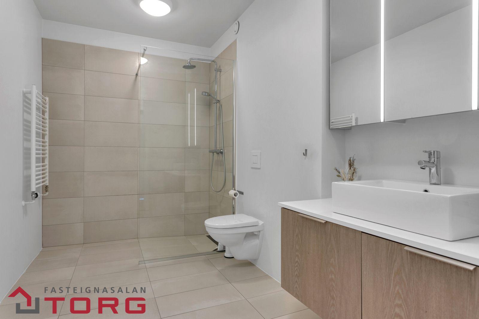 Baðherbergi: á baðherberginu er stór stuta með glerskilrúmi, gólfið er flísalagt ásamt vegg við sturtu. Ljós innrétting og spegla efriskápar. Salerni er upphengt og handklæðaofn er á baðherberginu.