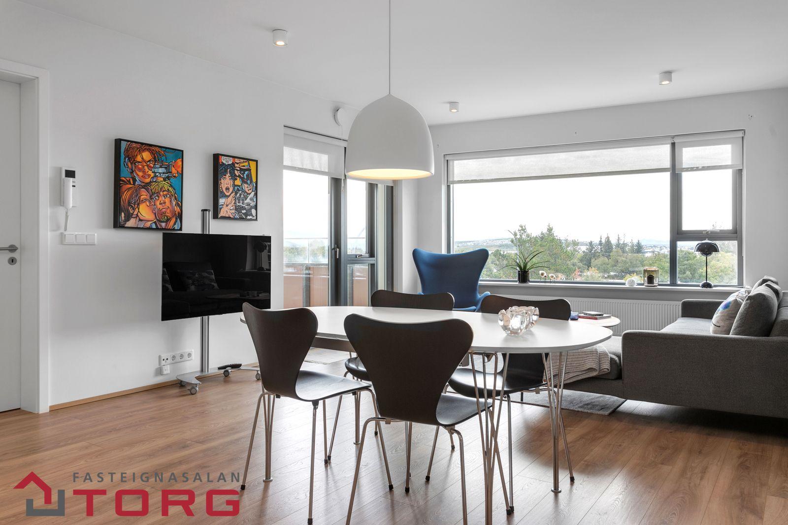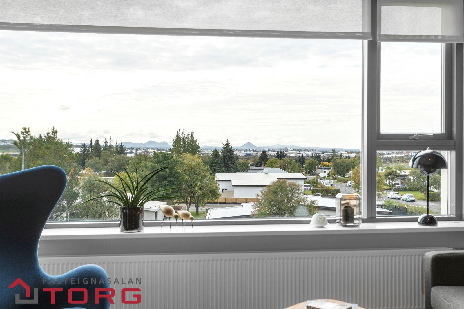 Stofa: Stofan er mjög björt og falleg og samliggjandi eldhúsi. Frábært útsýni er frá stofunni og útgengt er á suðursvalir. Stofan rúmar einnig borðstofu.