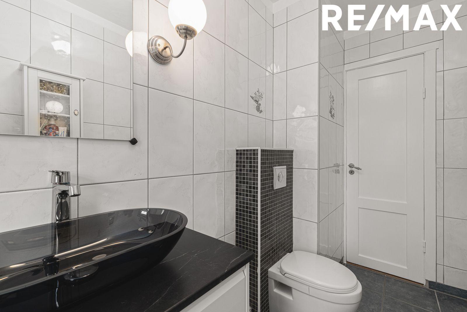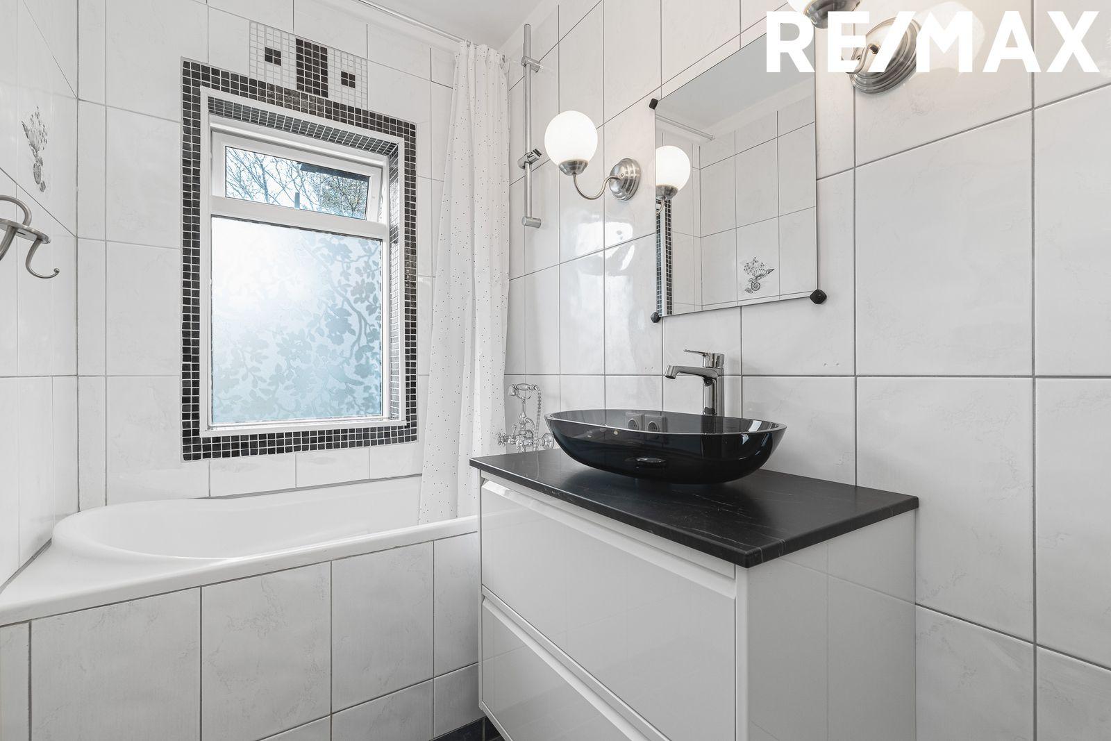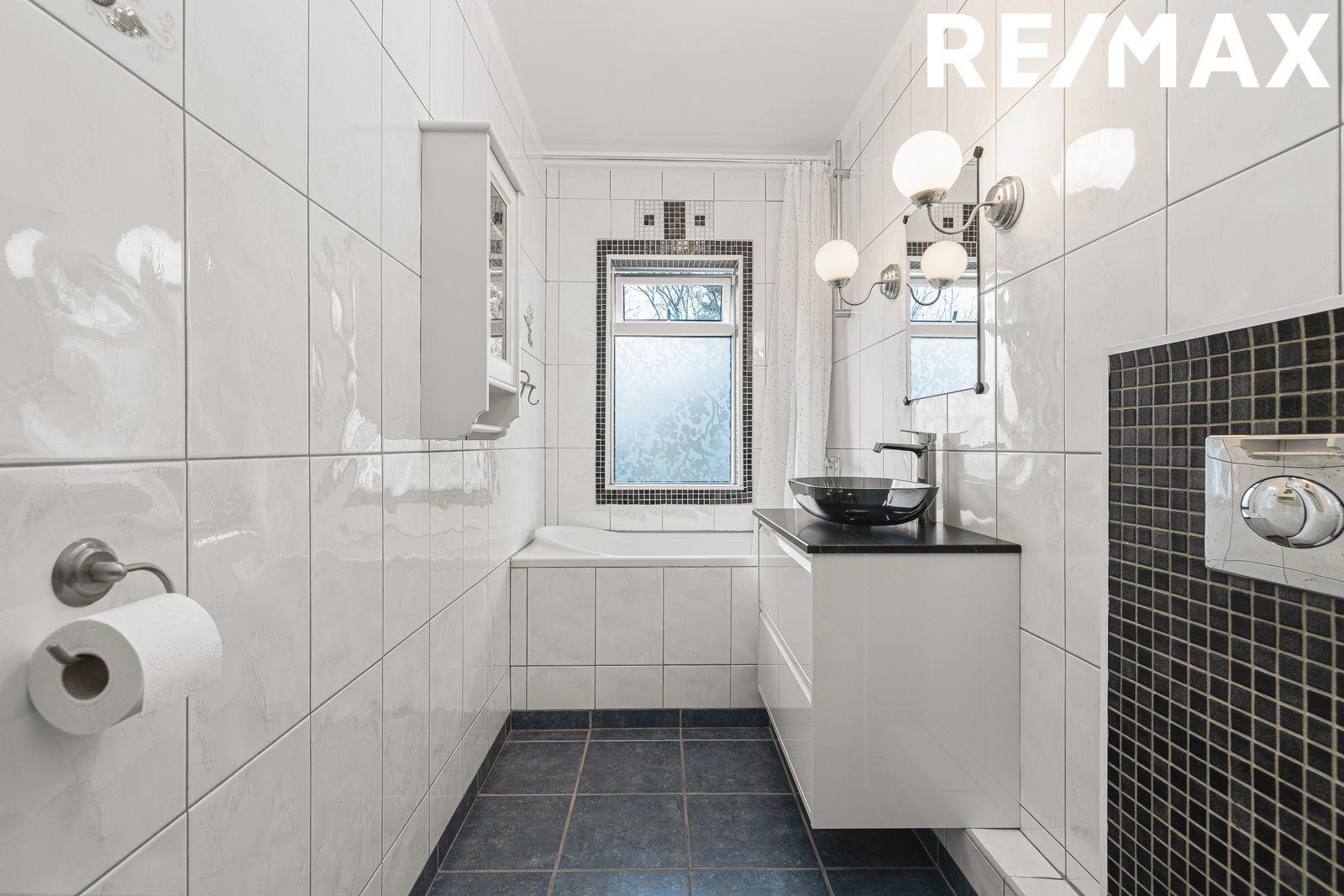 Baðherbergi er flísalagt í hólf og gólf. Hvítar flísar upp veggi og dökkar gólfflísar. Hvít skápaeining undir svarti handlaug og borði. Baðkar og upphengt salerni.