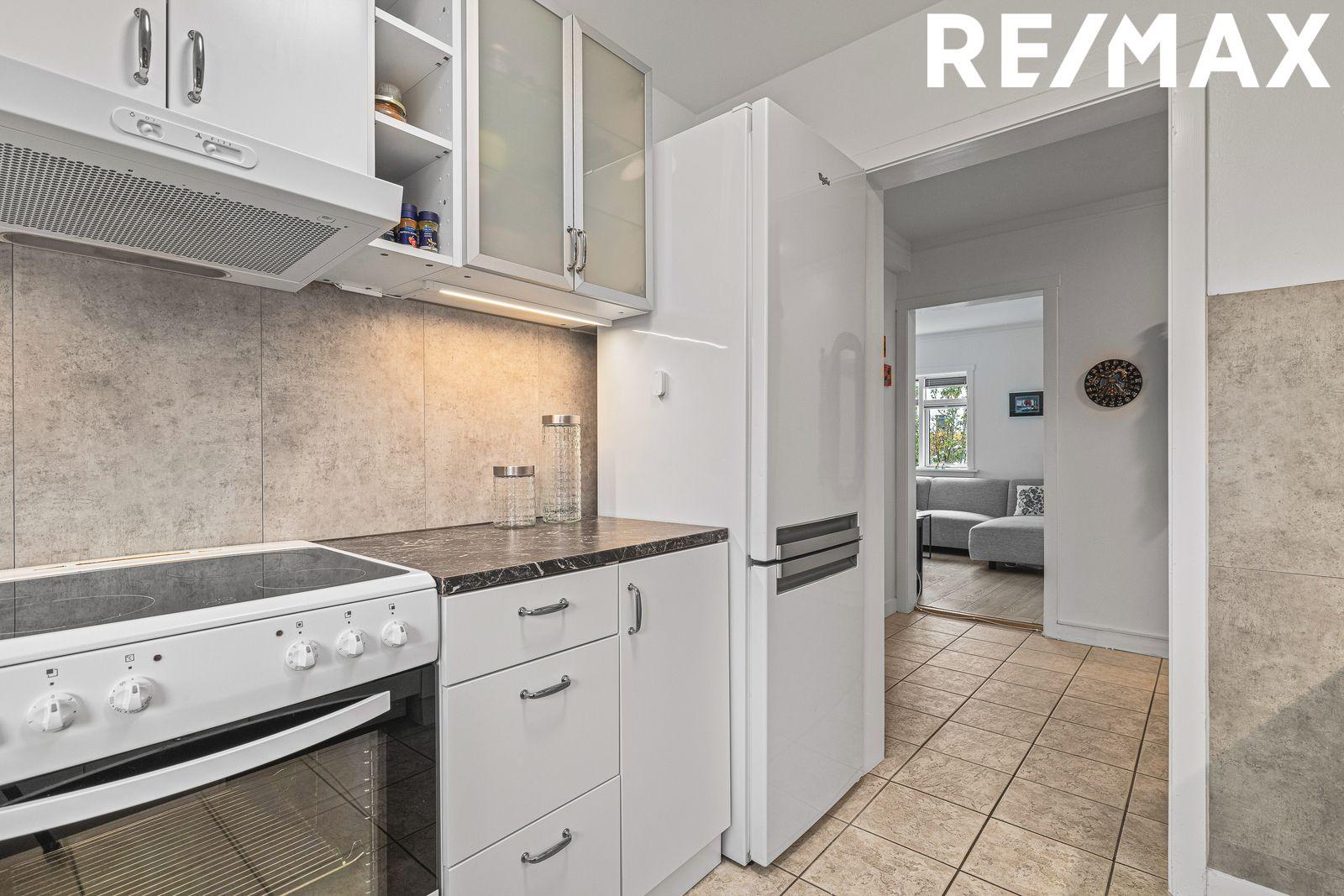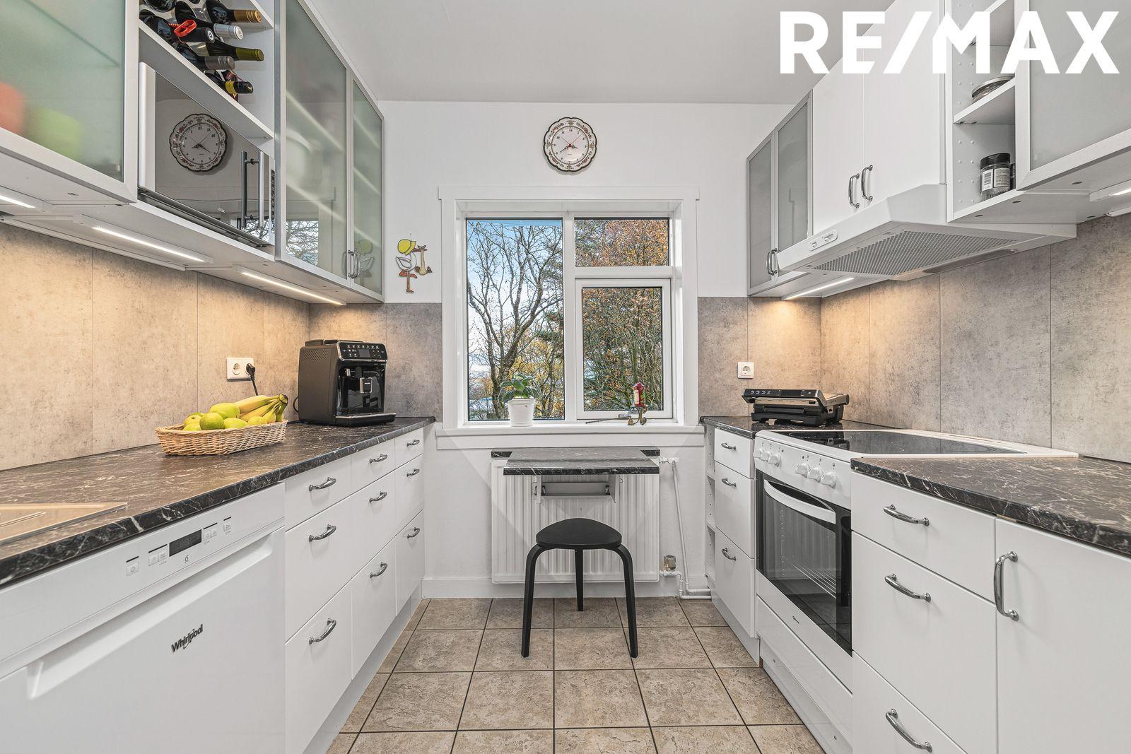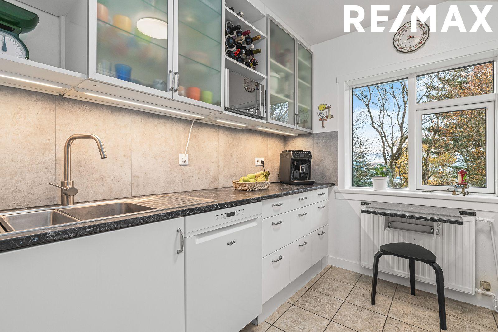 Eldhús er með hvítri innréttingu á tveimur veggjum. Nýleg innrétting á öðrum vegg, borðplötur og fibotrespo veggplötur á milli efri og neðri skápa. Stæði er fyrir uppþvottavél. Lítið felliborð er undir glugga. Ljósar gólfflísar.