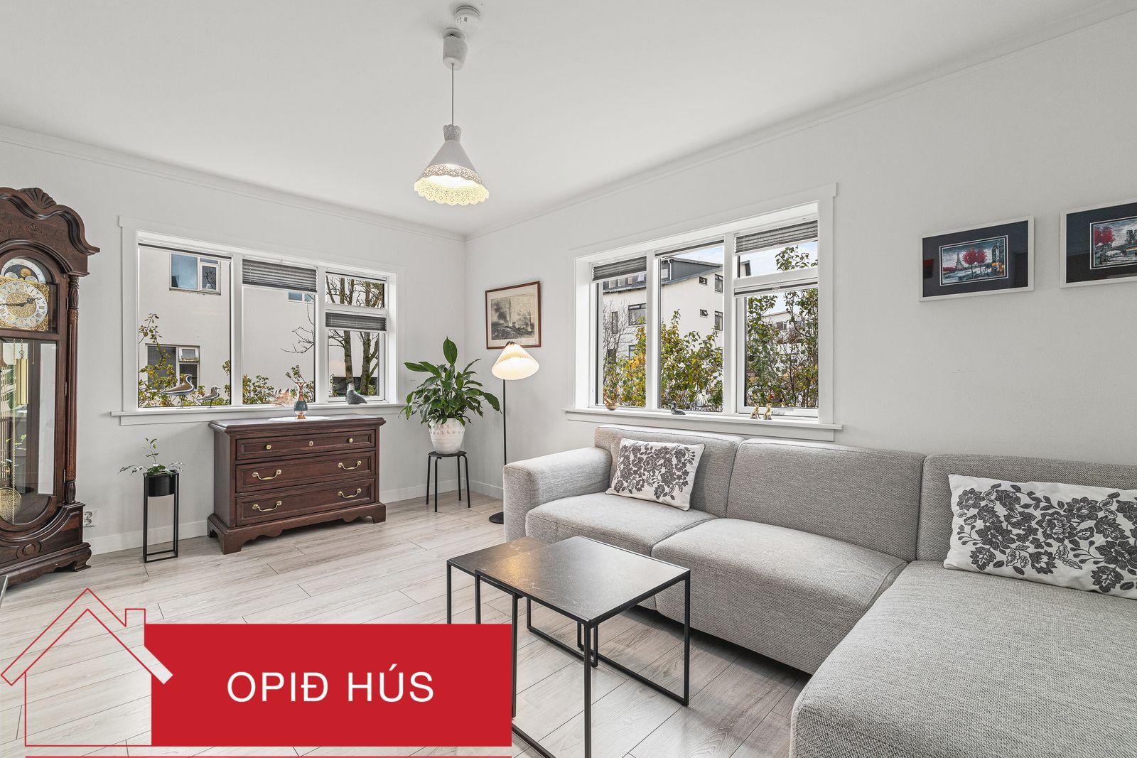 Stofa og borðstofa er tvískipt rými og væri möguleiki að útbúa herbergi í hluta af stofu. Gluggar eru á tvo vegu, þrjú opnanleg fög. Parket á gólfi.