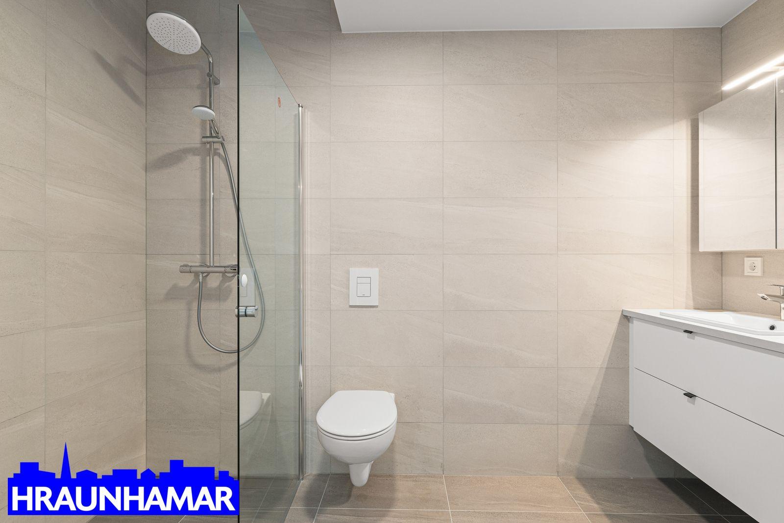 Flísalagt baðherbergi með innréttingu, upphengdu salerni og sturtu, þar er þvottaaðstaða.
