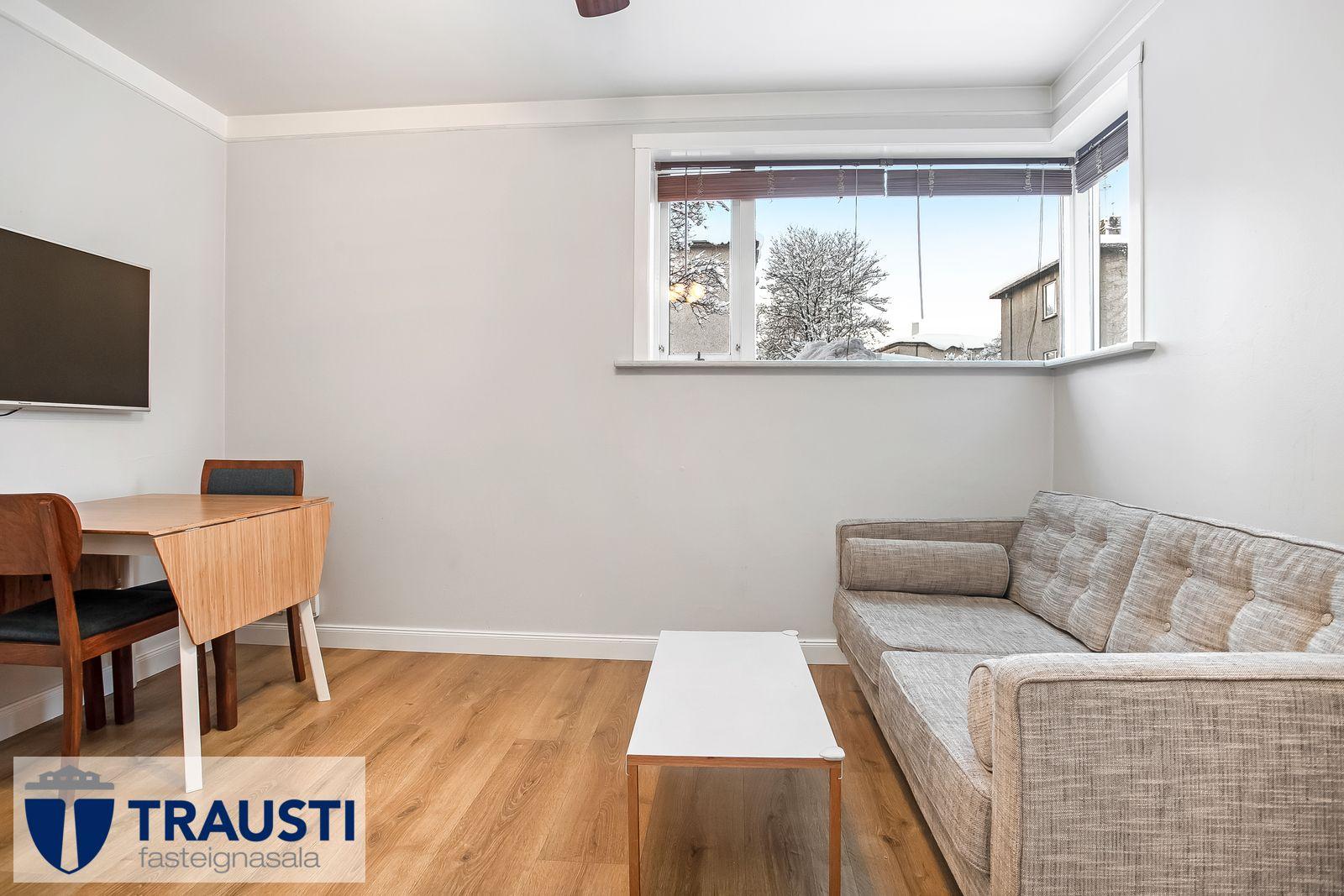 Stofa rúmgóð og björt með nýlegu parketi á gólfi.