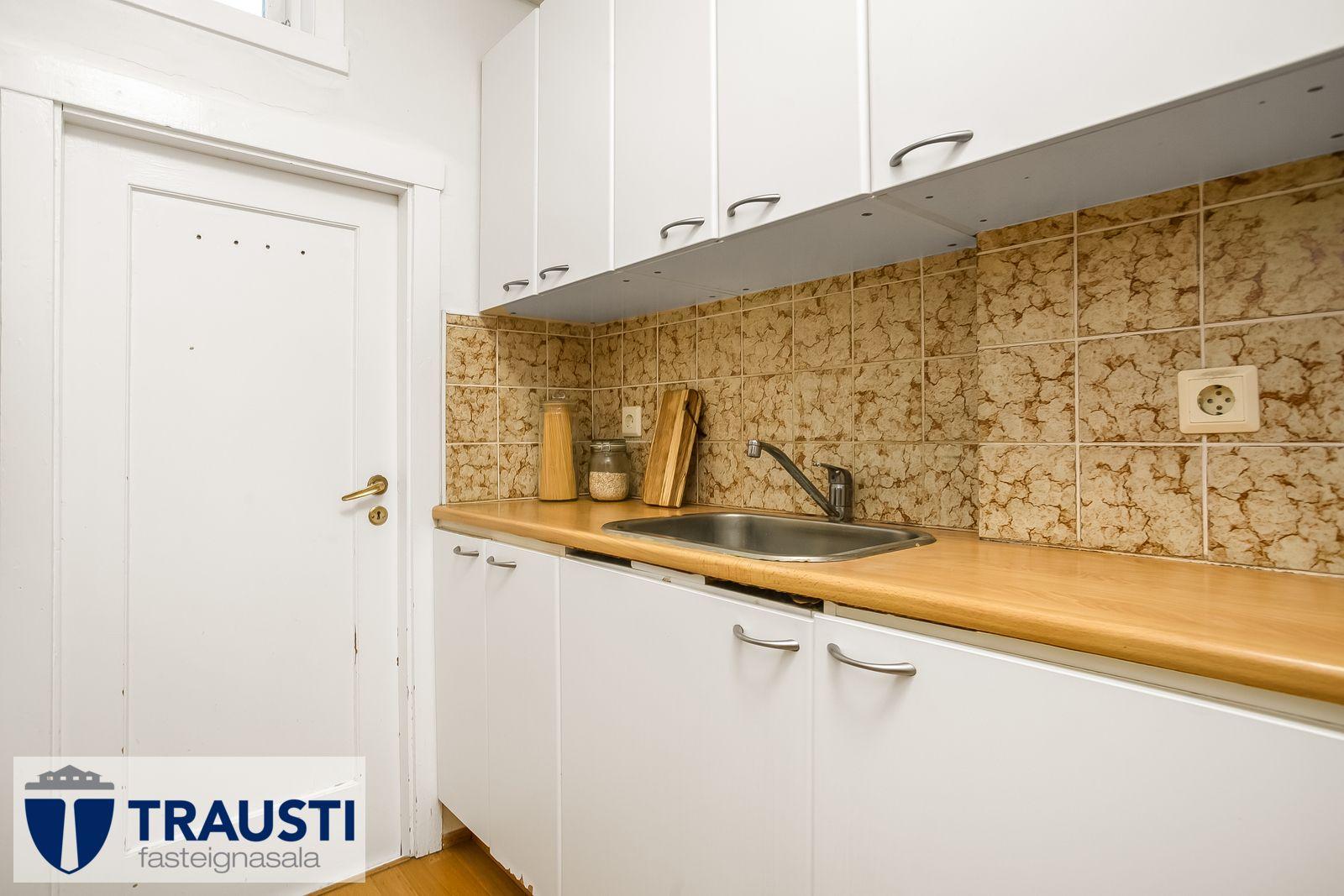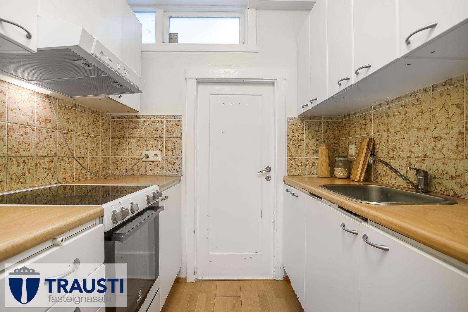 Eldhús með snyrtilegri innréttingu, eldavél, gufugleypir, flísar á milli skápa og parket á gólfi. Nýtt parket er til og fylgir eigninni sem hægt er að setja á eldhúsið. Geymsla er inn af eldhúsi.