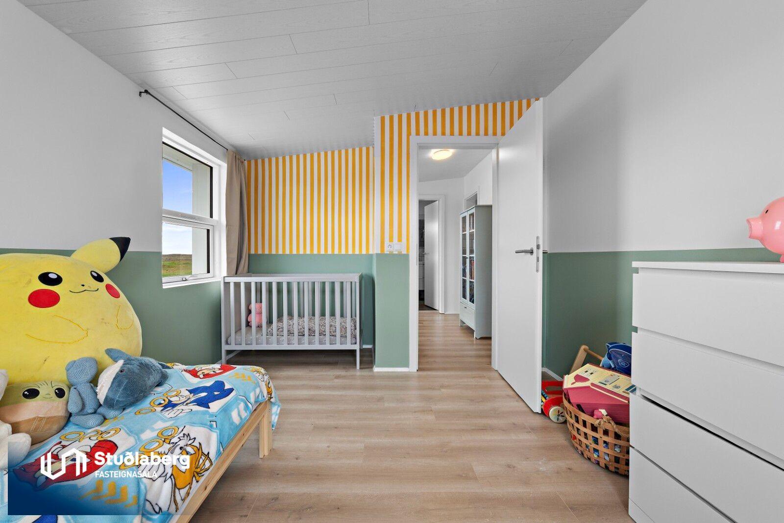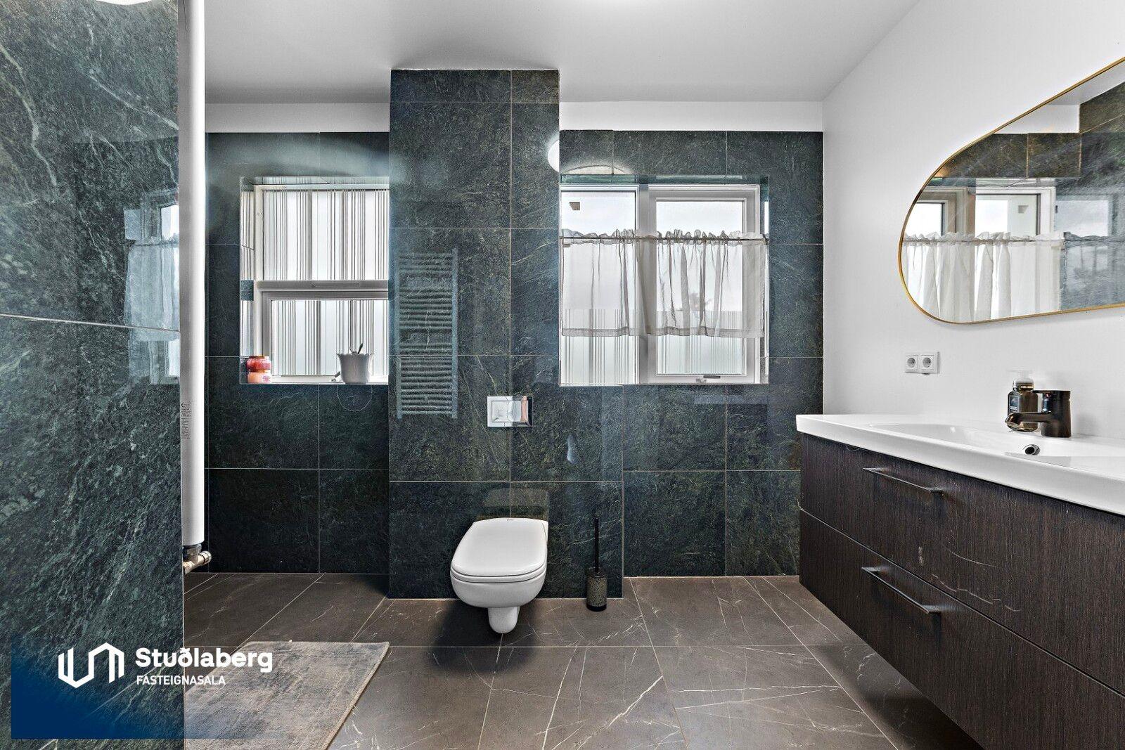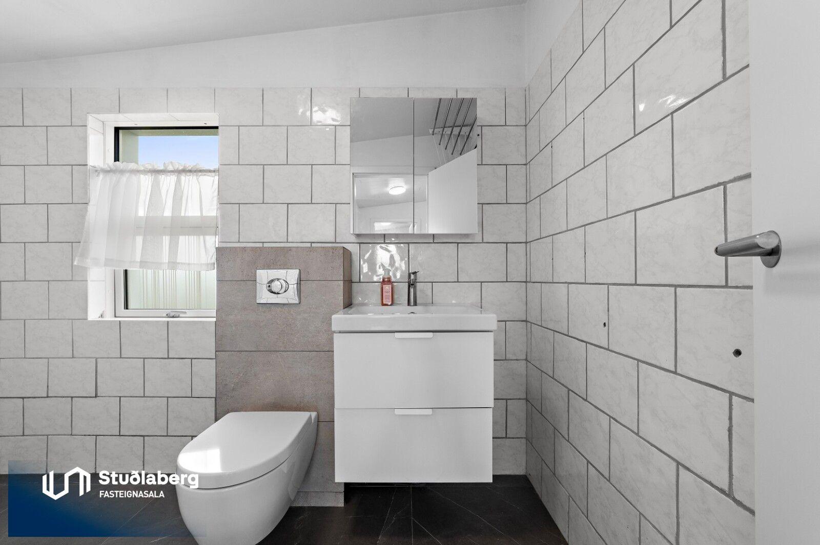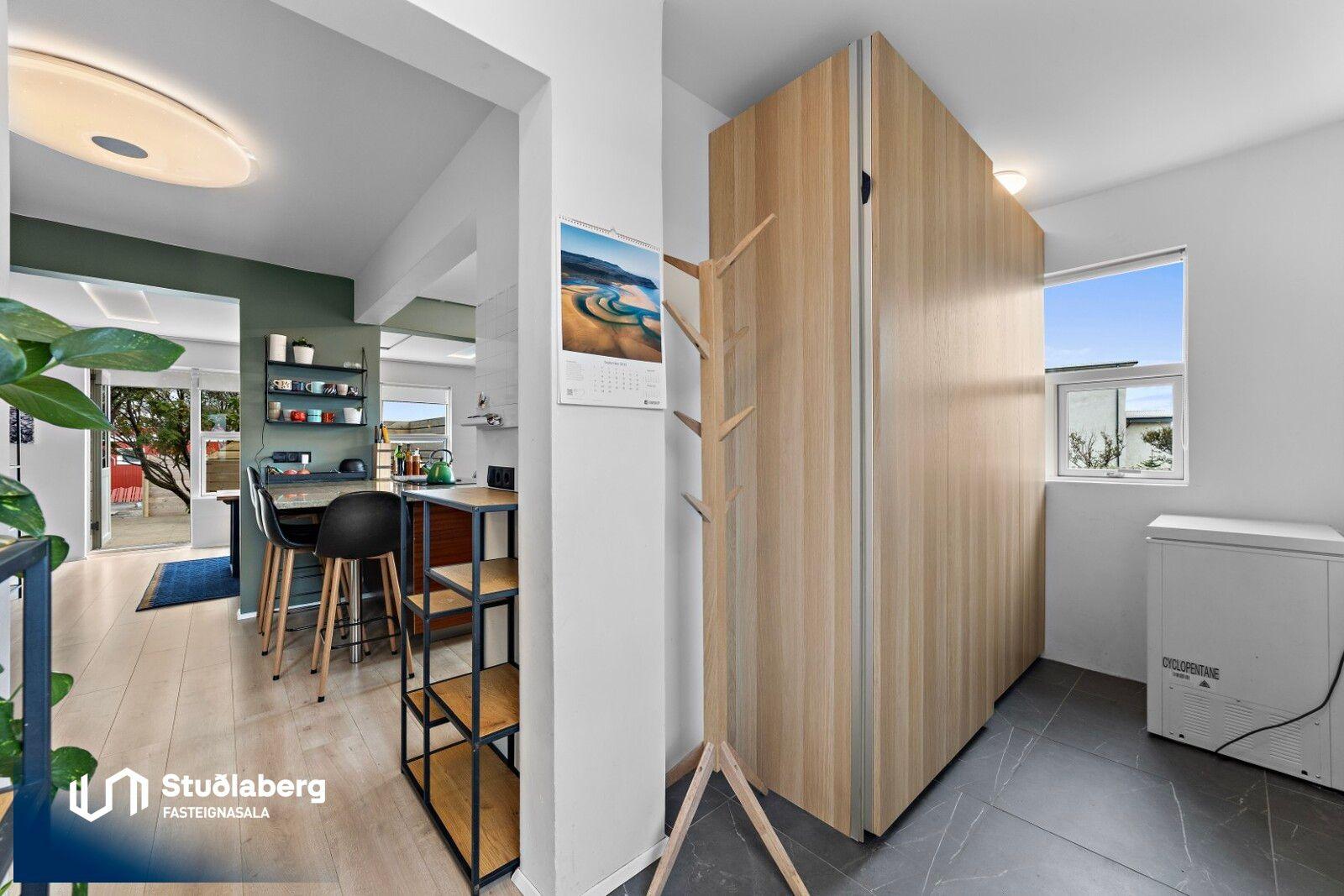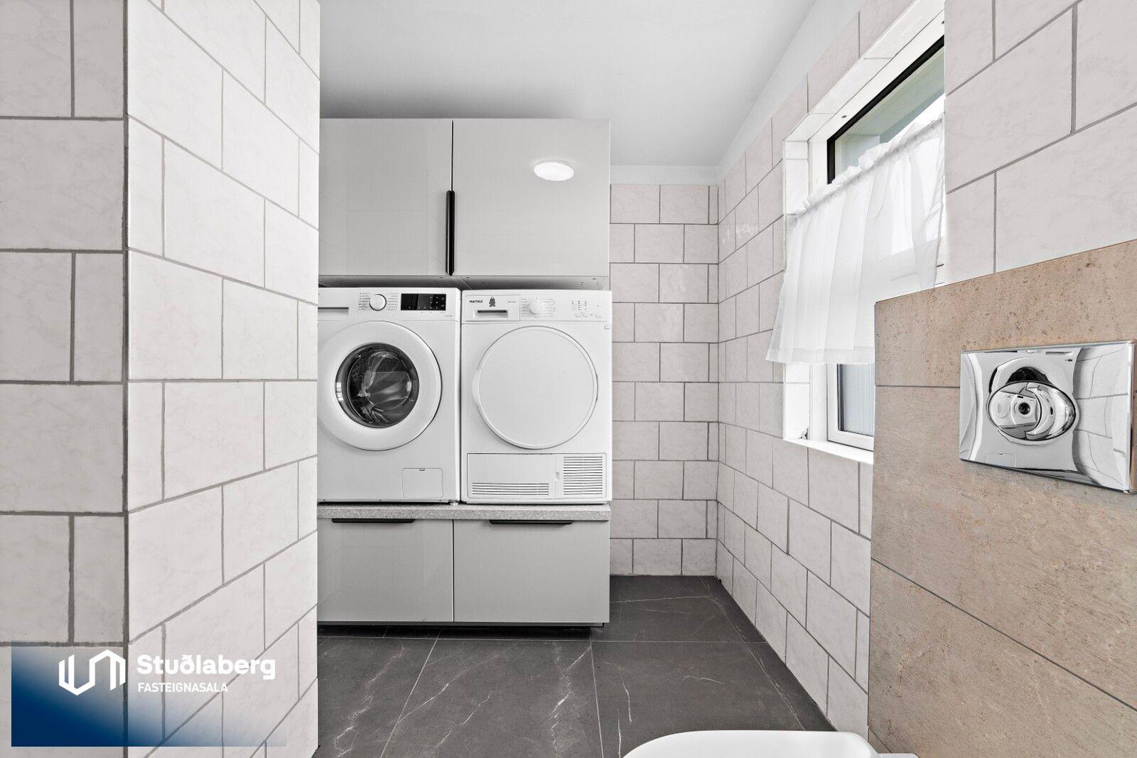 Eignin skiptist í forstofu, hol, eldhús, tvær stofur, baðherbergi og geymslu á neðri hæð og þrjú svefnherbergi og baðherbergi á efri hæð. Aðstaða fyrir þvottavél er á baðherbergi á eh.