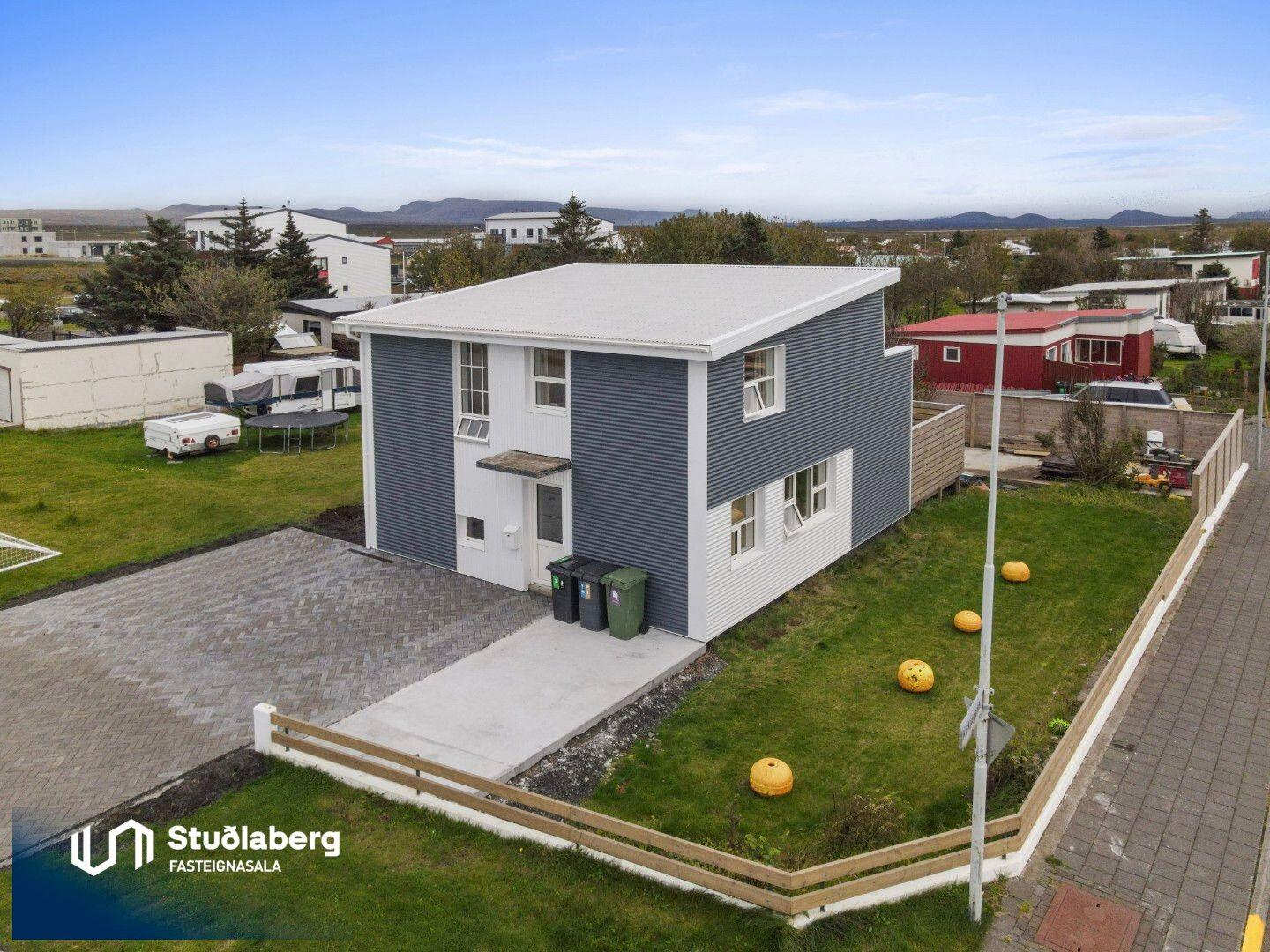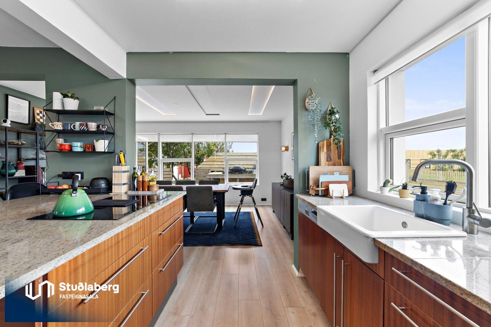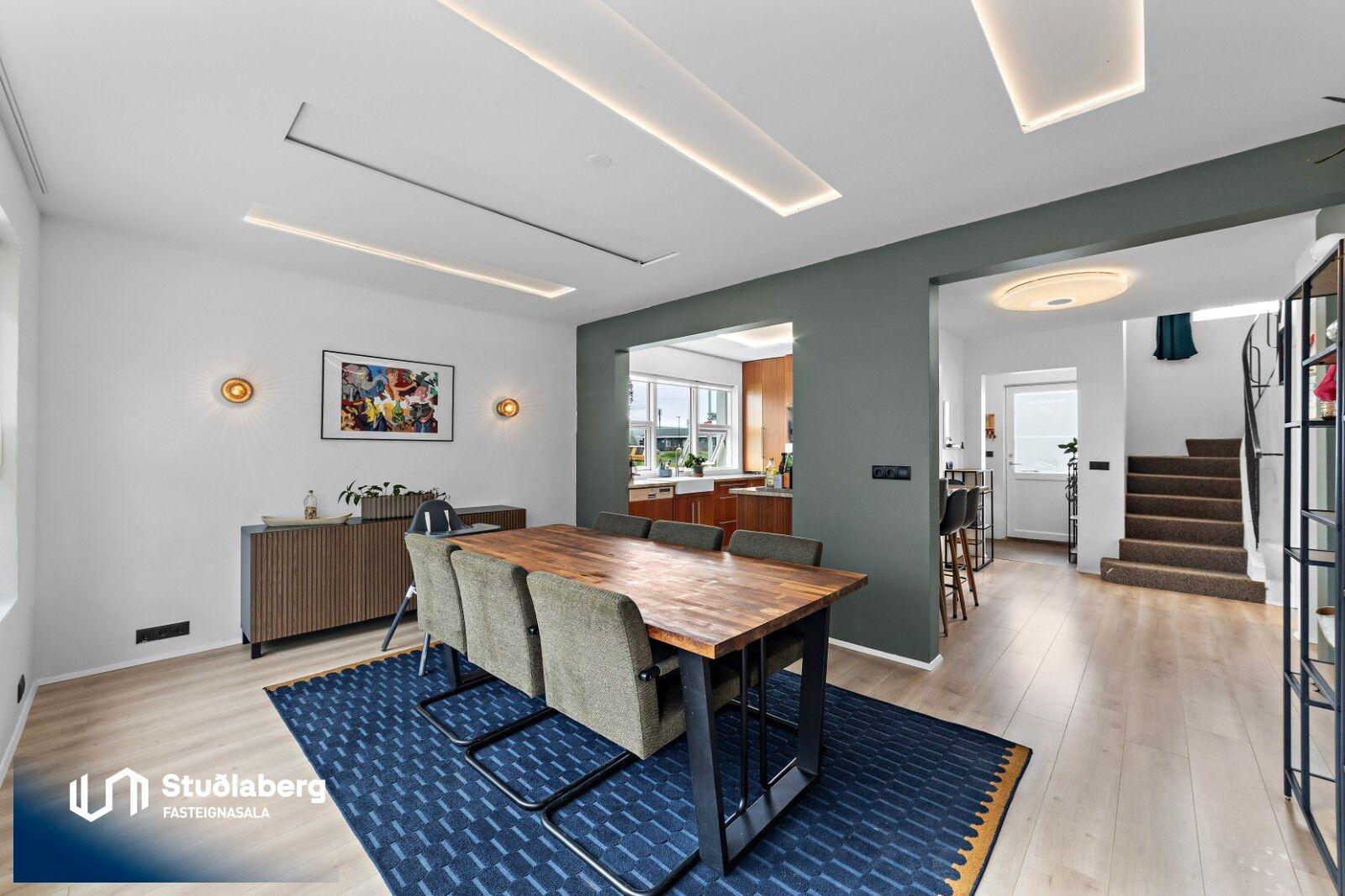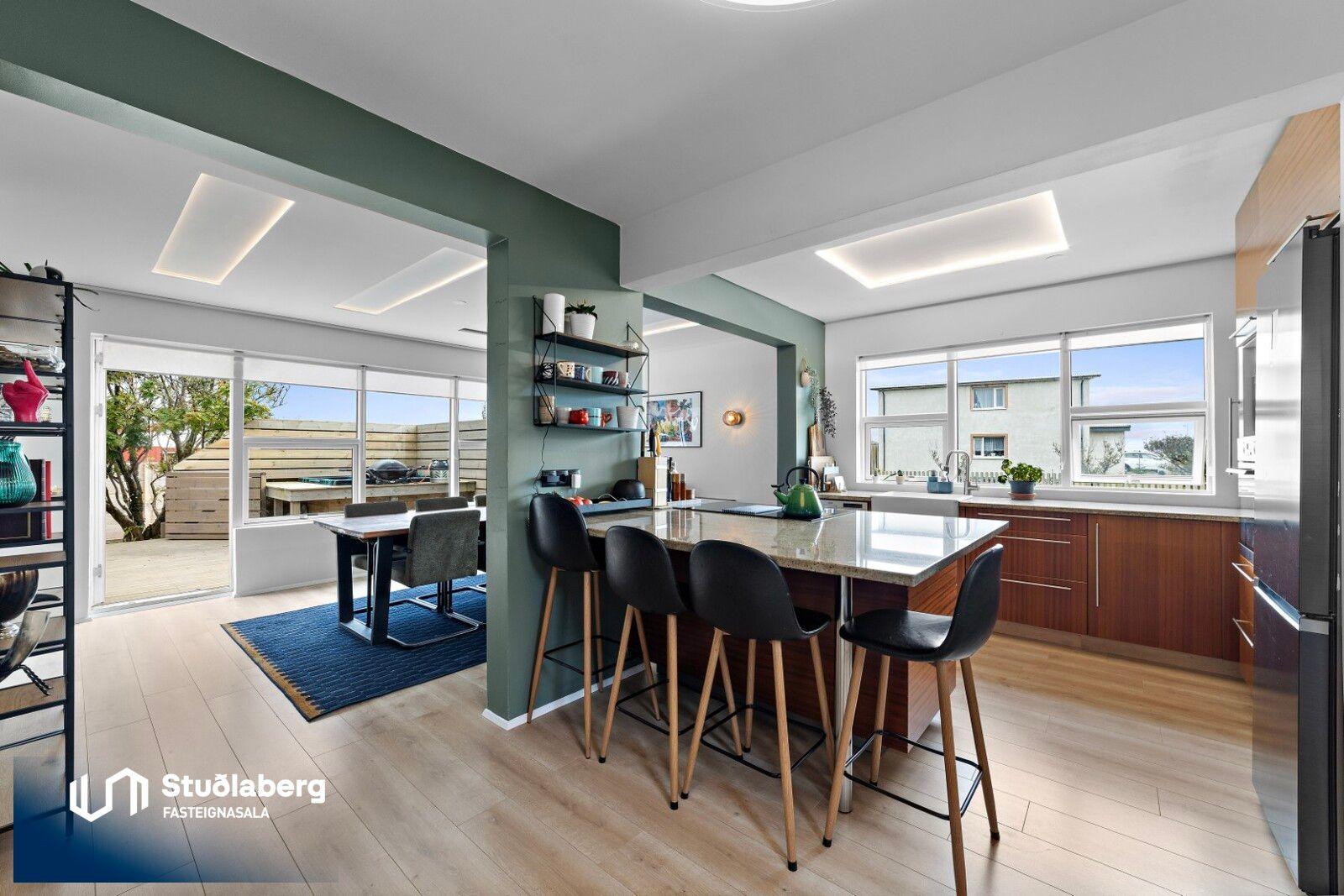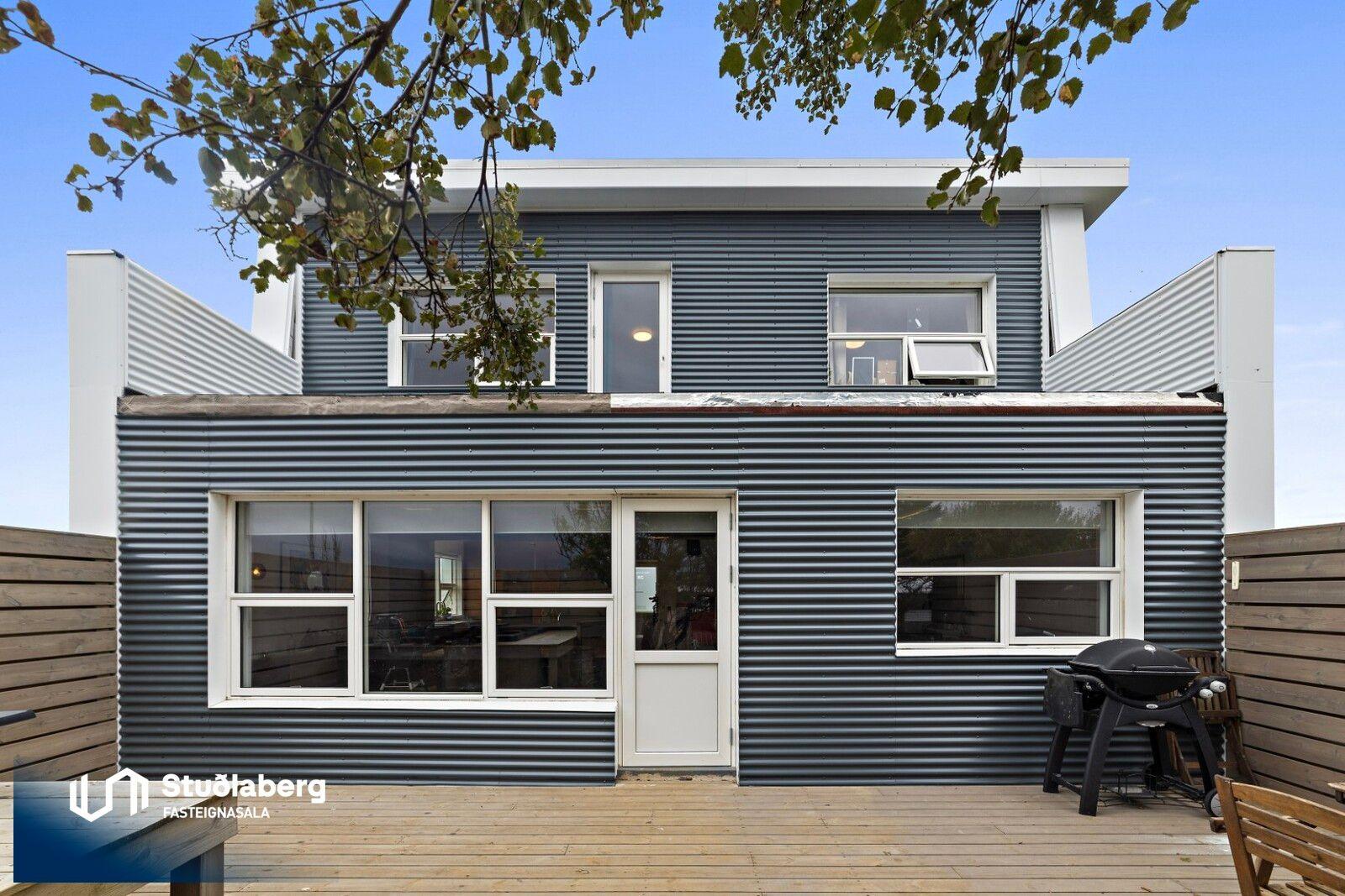 Stuðlaberg Fasteignasala kynnir í einkasölu 142,3 fm einbýlishús á tveimur hæðum ásamt 34,5 fm bílskúr. Birt stærð eignarinnar er 176,8fm.
