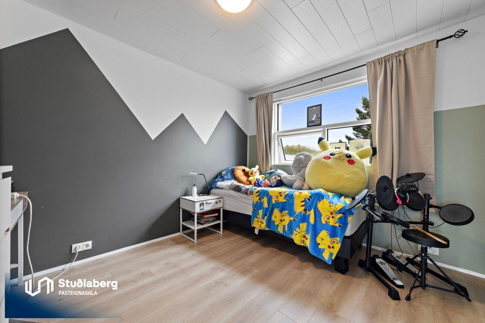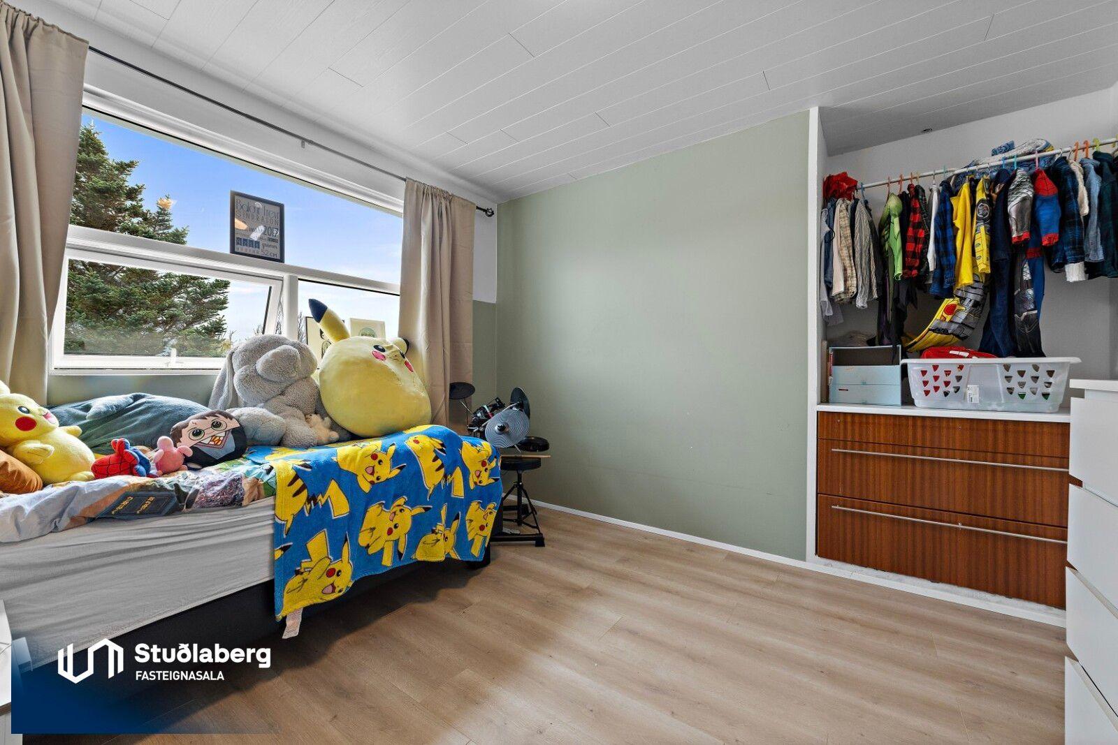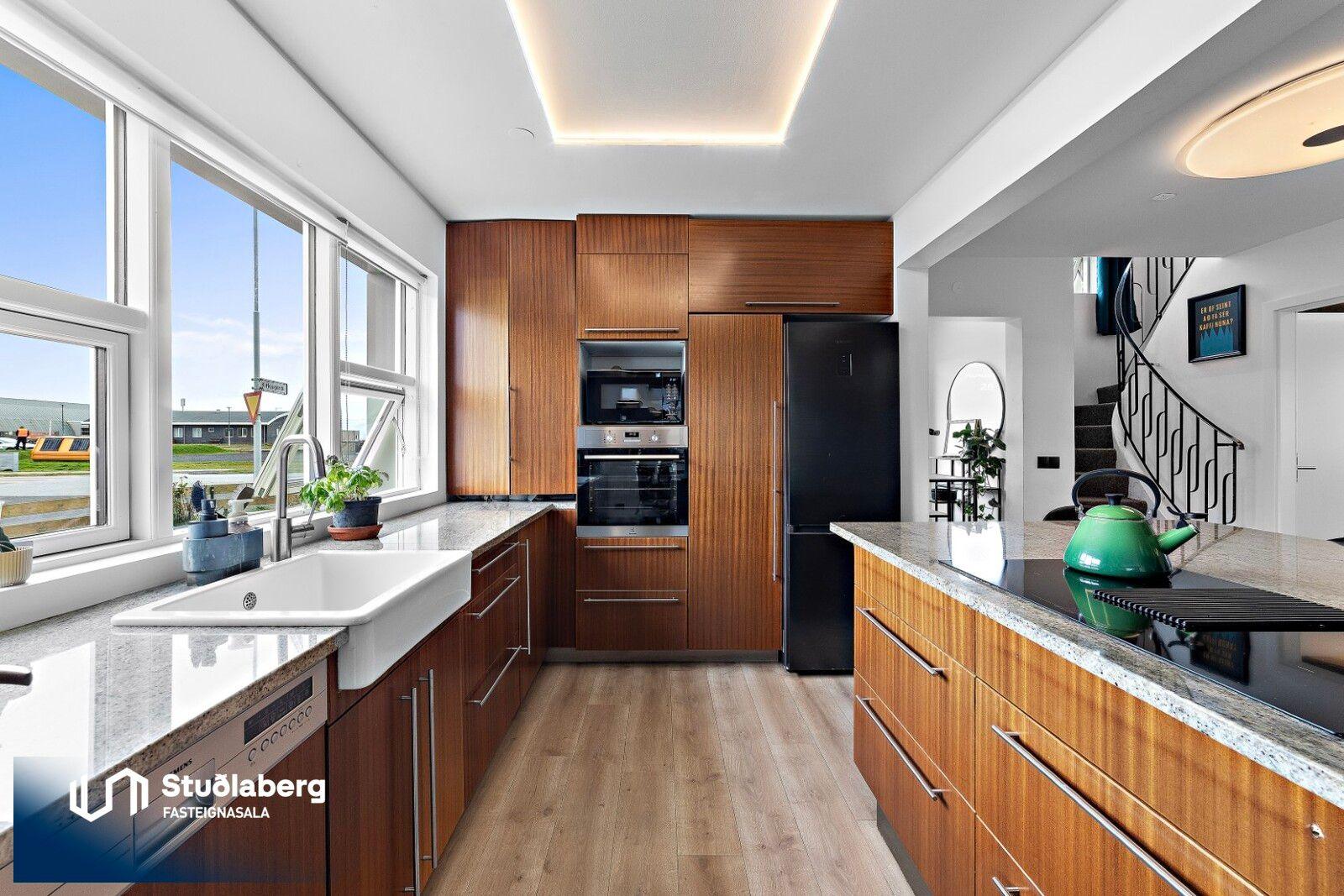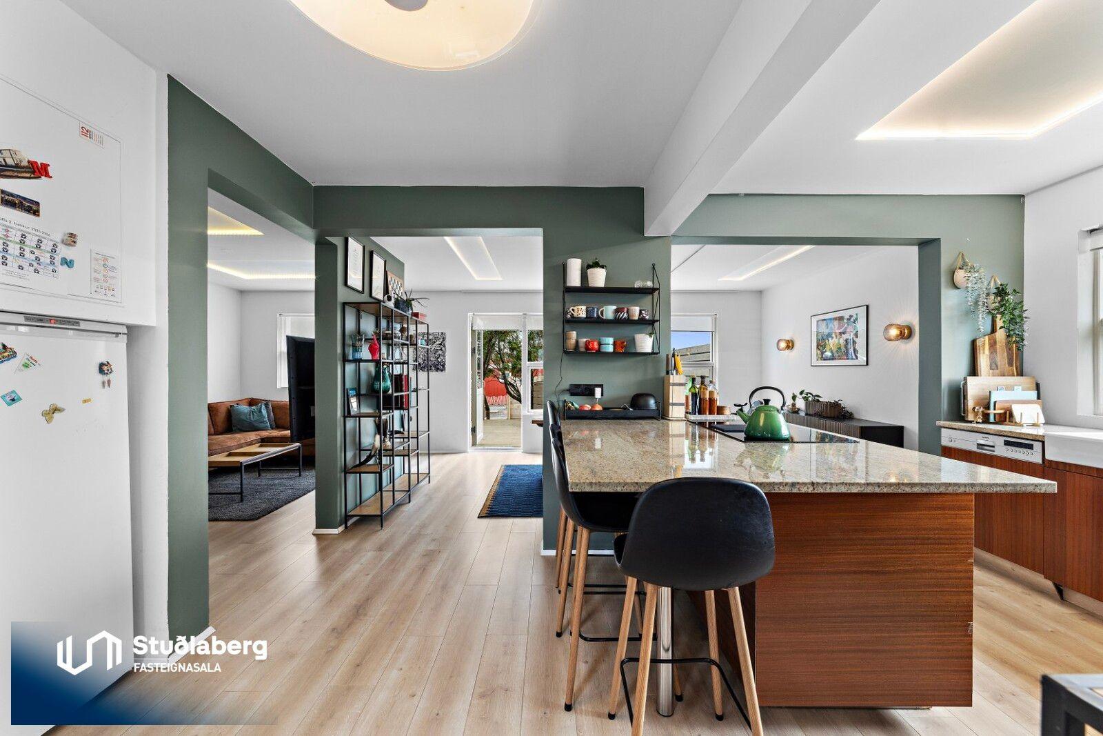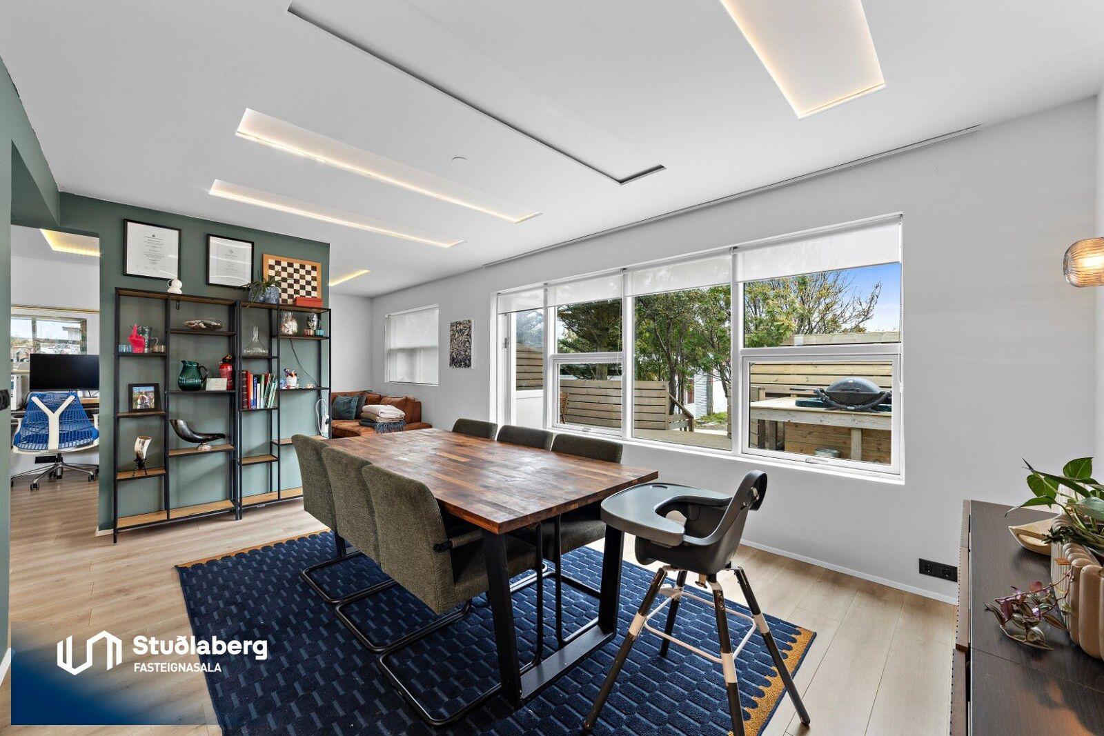 Stuðlaberg Fasteignasala kynnir í einkasölu 142,3 fm einbýlishús á tveimur hæðum ásamt 34,5 fm bílskúr. Birt stærð eignarinnar er 176,8fm.