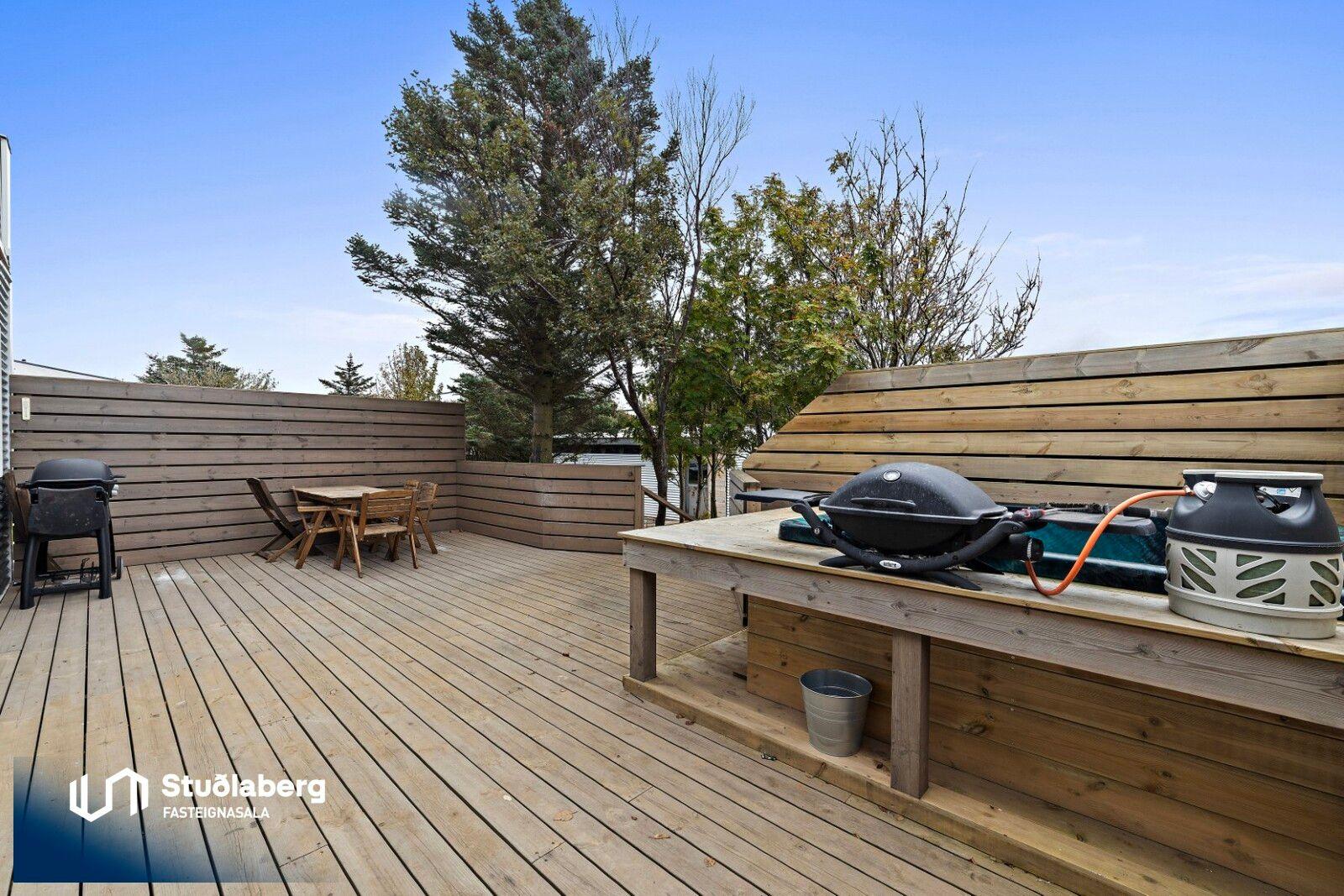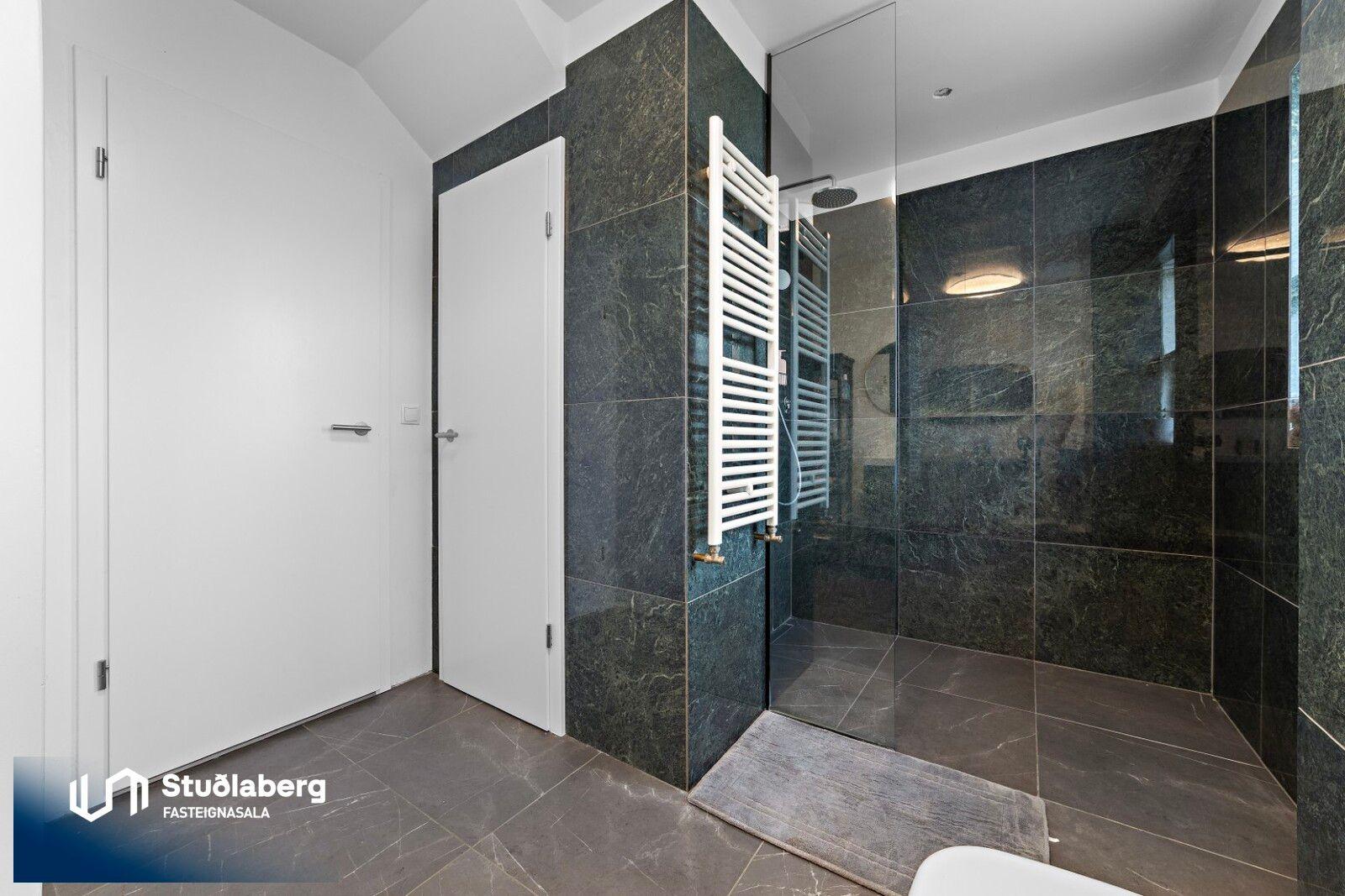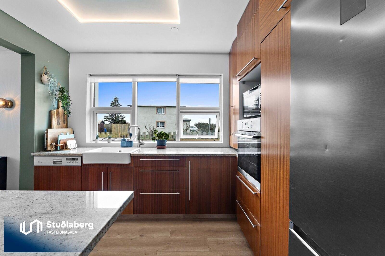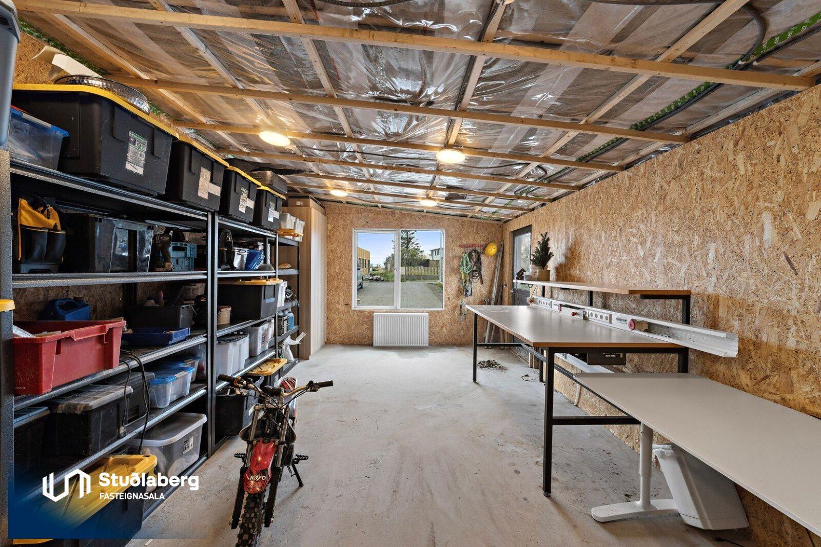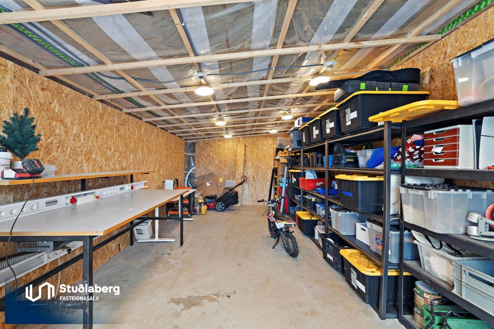 Forstofa er flísalögð og þar er hengi og handklæðaofn. Hol er parketlagt Í eldhúsi er parket á gólfi, þar er innrétting, granít borðplötur, eldavél með innbyggðum háf og innbyggð uppþvottavél. Stofa er parketlögð og hurð er út á afgirta verönd frá stofu. Heitur pottur er á verönd. Á baðherbergi eru flísar bæði á gólfi og veggjum, þar er innrétting, upphengt salerni, handklæðaofn og flísalögð sturtuaðstaða stúkuð af með gleri. Geymsla hefur málað gólf. Svefnherbergin eru þrjú og eru þau öll parketlögð. Stór skápur er í hjónaherbergi. Öll herbergin eru uppi. Á baðherbergi á efri hæð eru flísar á gólfi og aðstaða fyrir þvottavél og þurrkara. Bílskúr : Ný eingangrun og klæðning og endurnýjað þakjárn. Nýjar lagnir út í skúr, neyslu-, hita-, skolp- og rafmangslagnir.