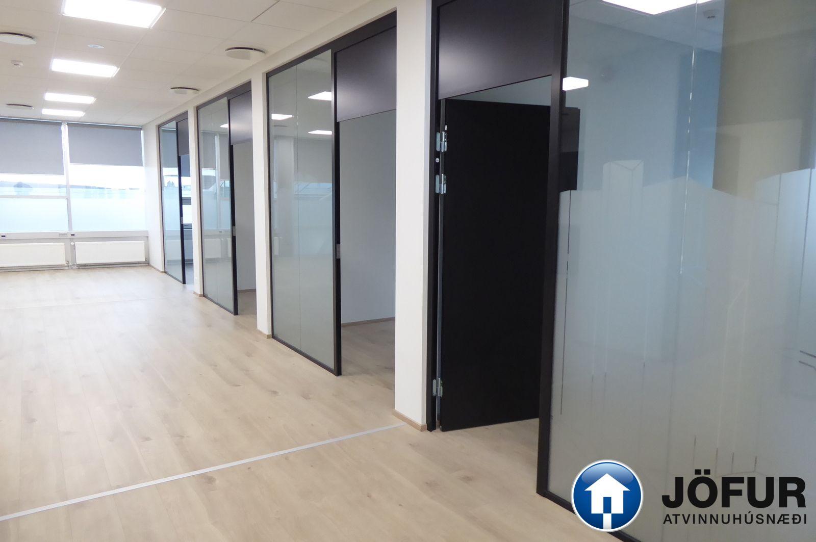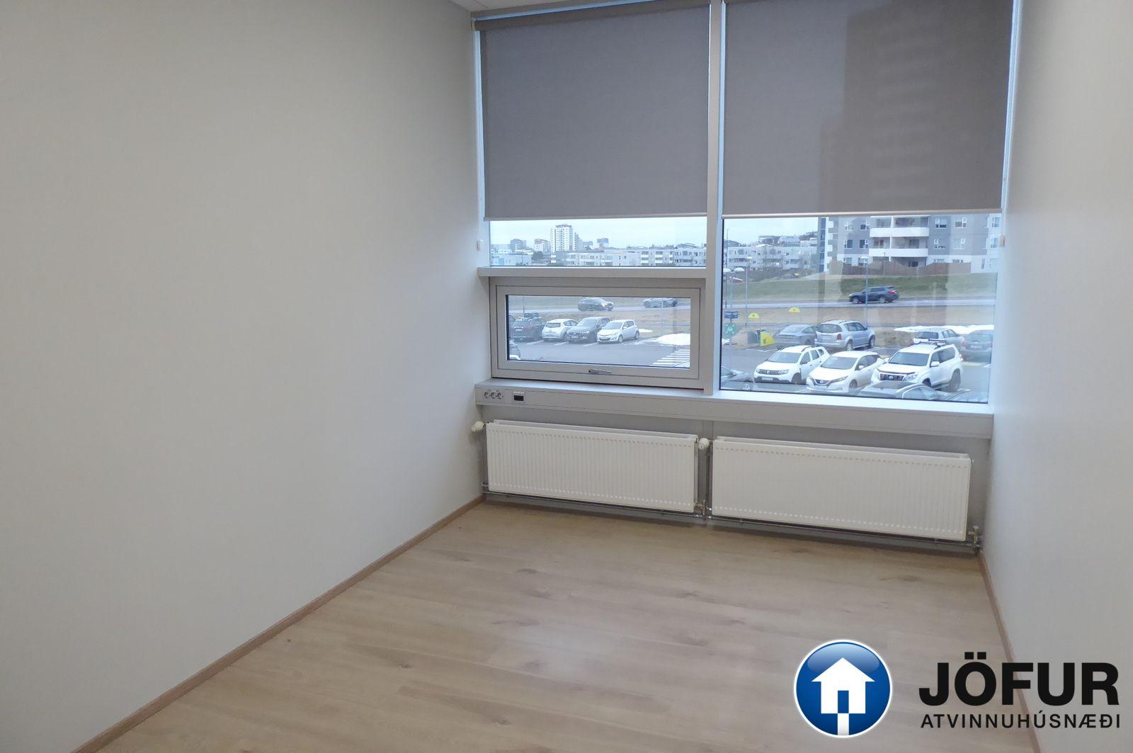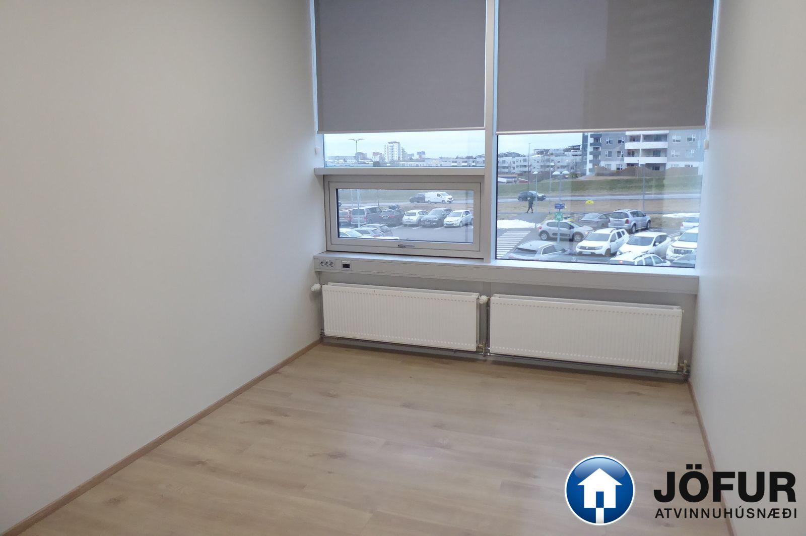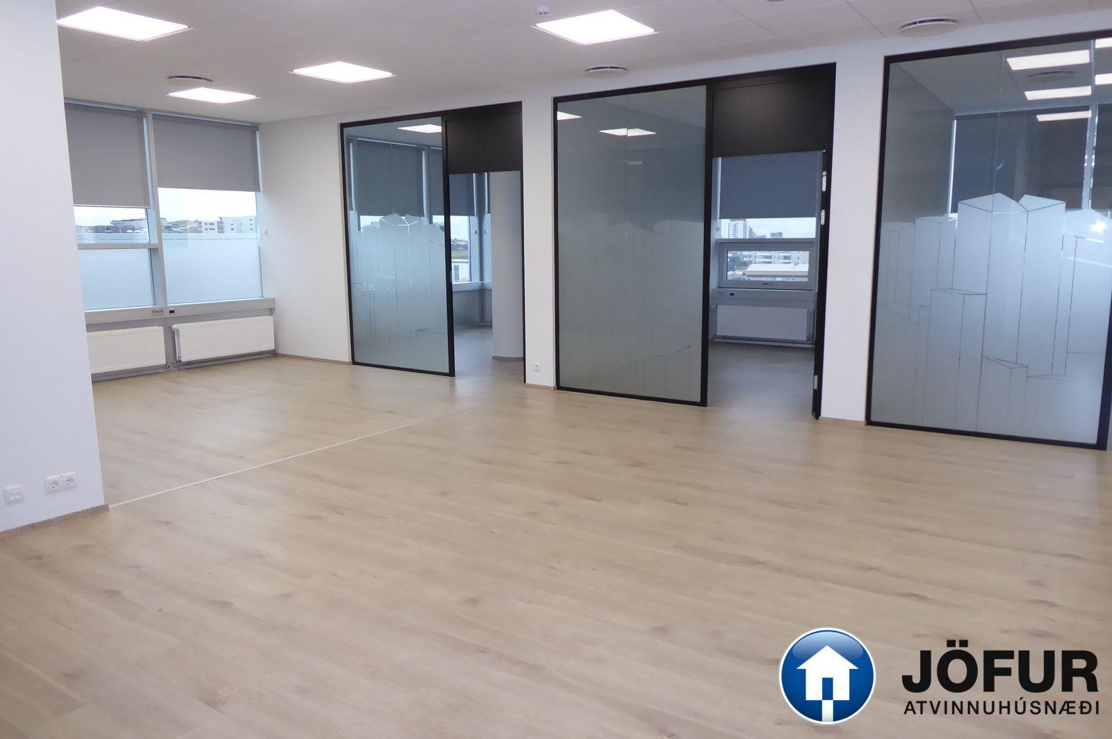Nánari lýsing: Húsnæðið skiptist upp í opið rými/ móttöku eitt stórt lokað skrifstofurými, 5 minni lokaðar skrifstofur, eitt fundarherbergi, eldhús/ kaffistofu, geymslu og 2 snyrtingar, (önnur með sturtuaðstöðu). Parket er á gólfum. Kerfisloft og lýsing í loftum. Næg bílastæði á lóð hússins. Verslun og þjónusta er á jarðhæðinni. Vel staðsett skrifstofuhúsnæði í Kópavogi. VSK leggst við leigufjárhæðina.
