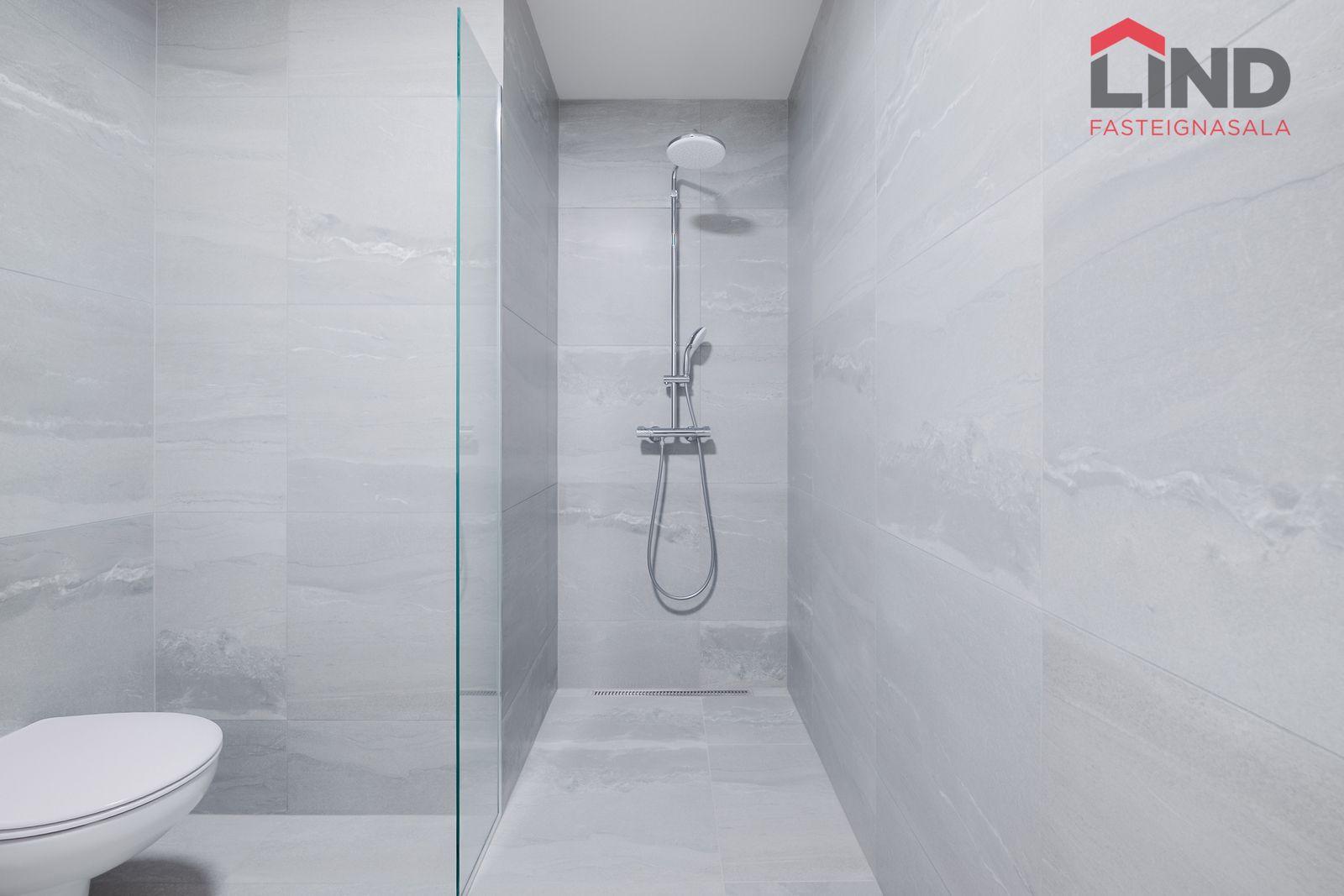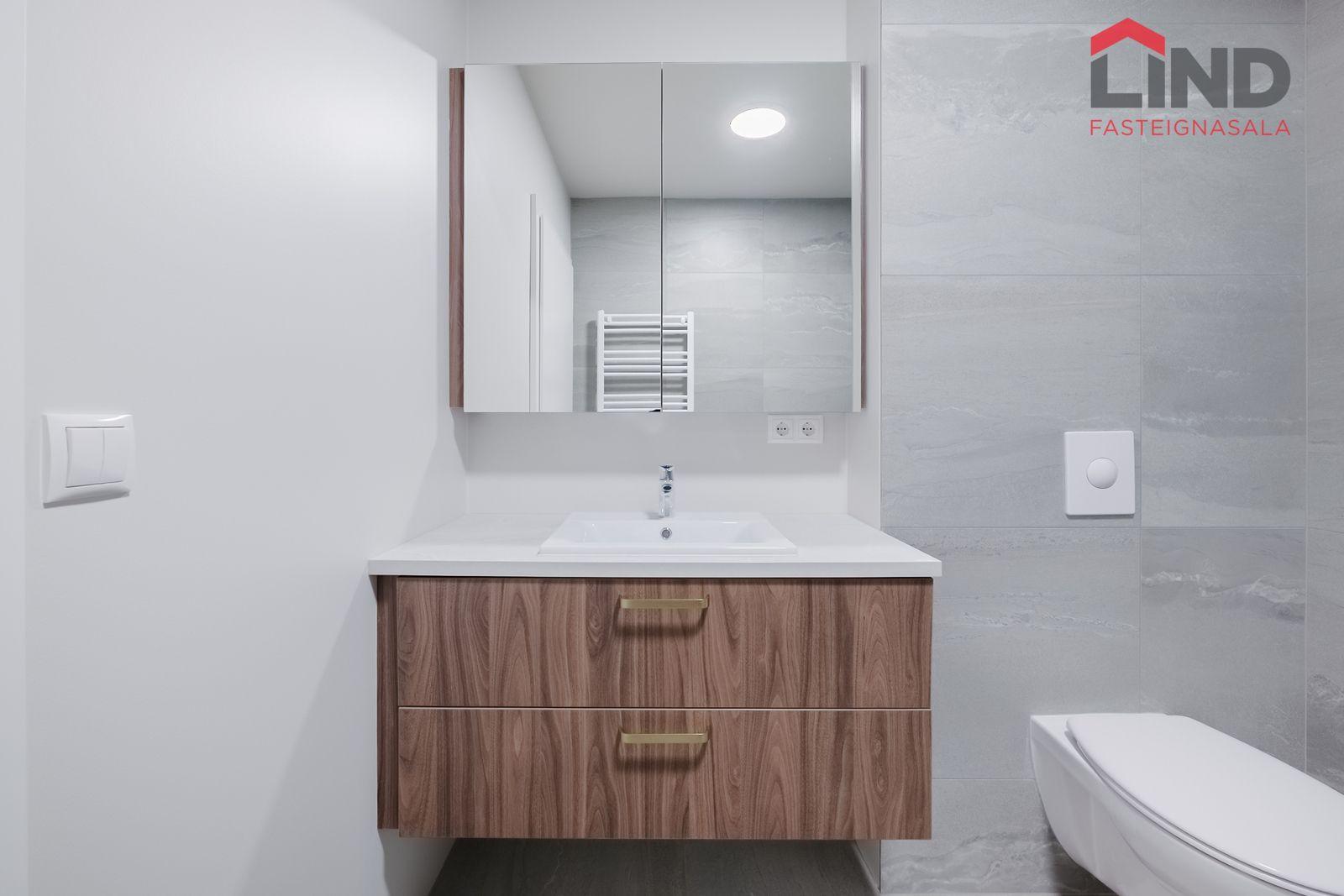 Baðherbergi: Baðinnrétting kemur frá Axis. Hreinlætistæki og handklæðaofn eru frá Byko. Salernið er upphengt og innbyggt. Hitastýrð blöndunartæki verða við sturtu. Gólf eru flísalögð og veggir að hluta upp í loft